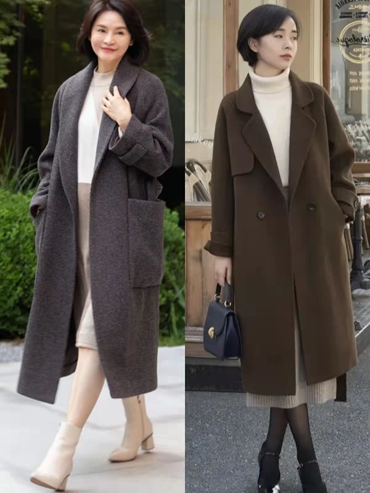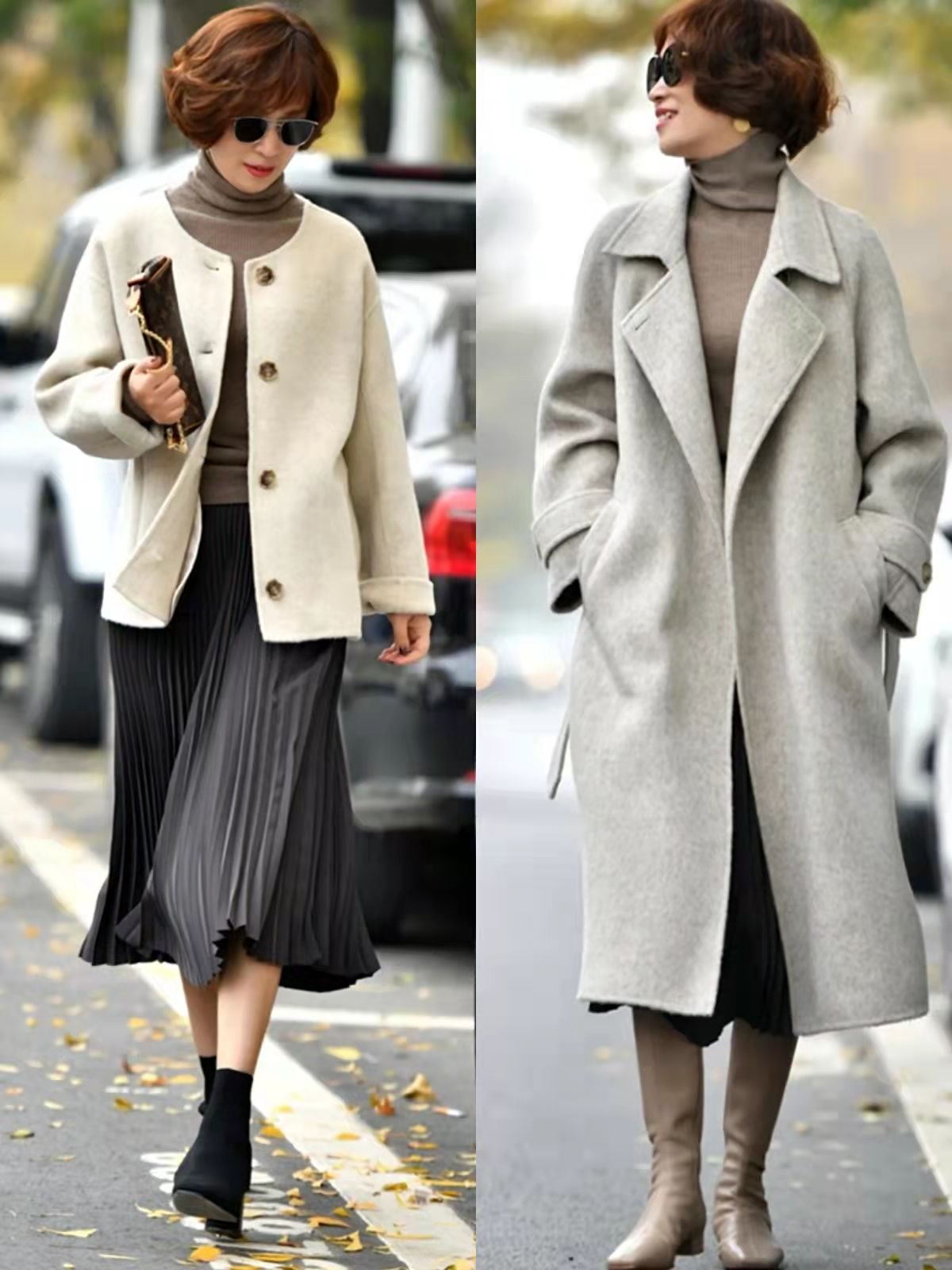 例如在寒冷冬季,熟齡女生可以通過調整上衣來勝任職場日常、室內室外的穿搭,其頂用呢大衣組合過膝裙、短靴的搭法最常見。
