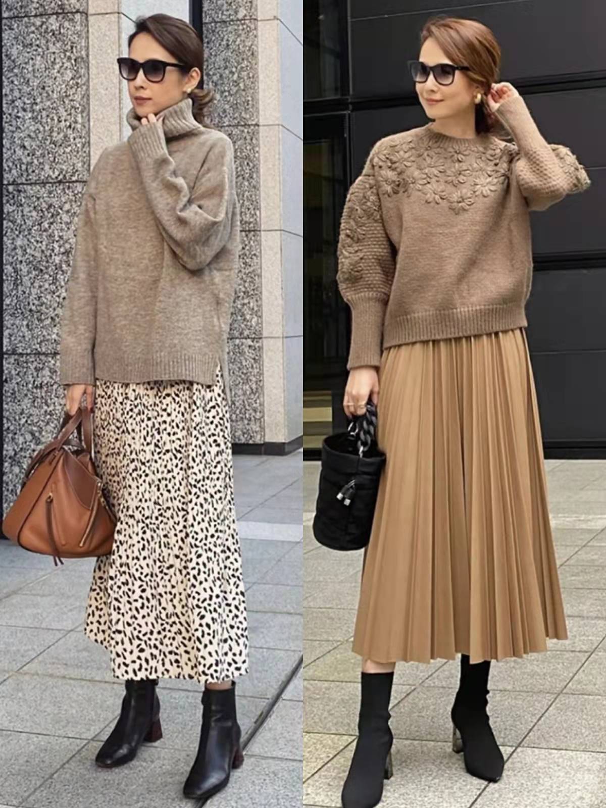 百褶裙最大好處在於對身材包容度大,在冬季如果擔心駕馭不了針織半身裙的熟齡女生,不妨用百褶裙來強調著裝的輕盈與靈動。