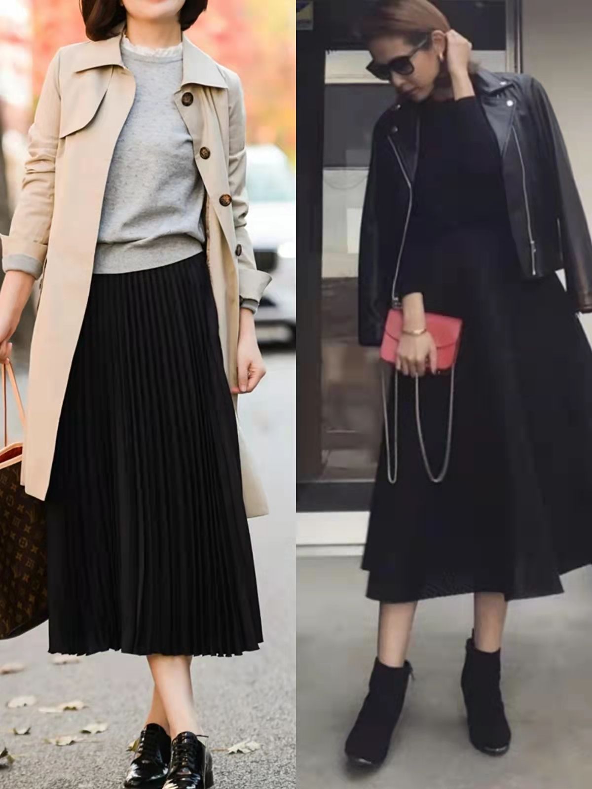 過膝裙與短靴的搭法整體上主打優雅時尚,如果穿搭時要改變穿衣風格,那麼可以試試比較颯爽利落的風衣或者皮衣,讓著裝既美又颯。