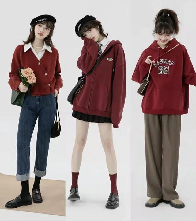 例如拉鏈款式的衛衣或者套頭款式的衛衣,以酒紅色進行搭配,下半身短裙或者是直筒褲,都能夠塑造出優雅又紳士的搶眼造型。