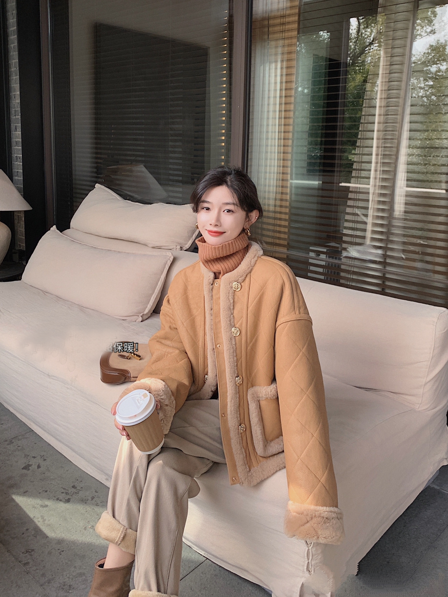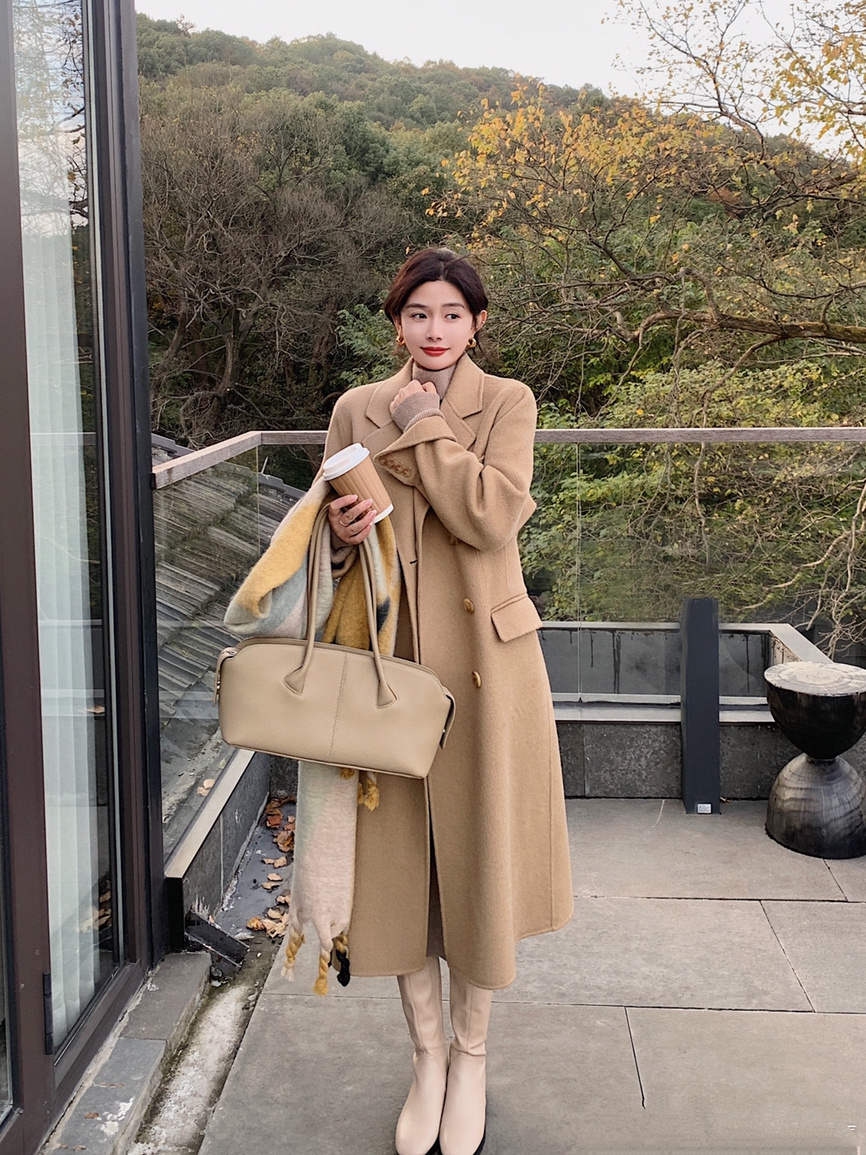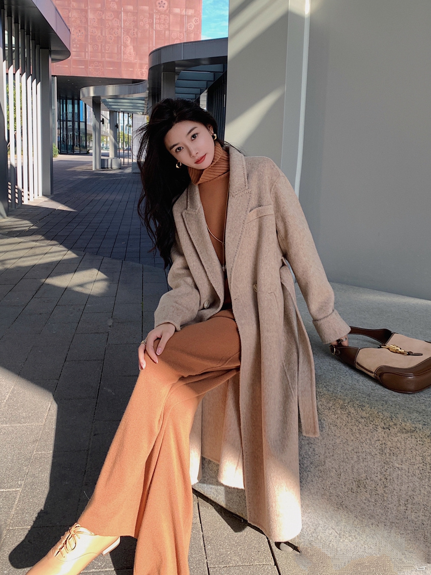 另一款卡其色大衣搭配選擇了卡其色高領毛衣作為打底,這種淺色系的同色系搭配,最大的優勢在於更加溫柔減齡,突出女性身上的柔美氣質,更適合大部分年輕女性。