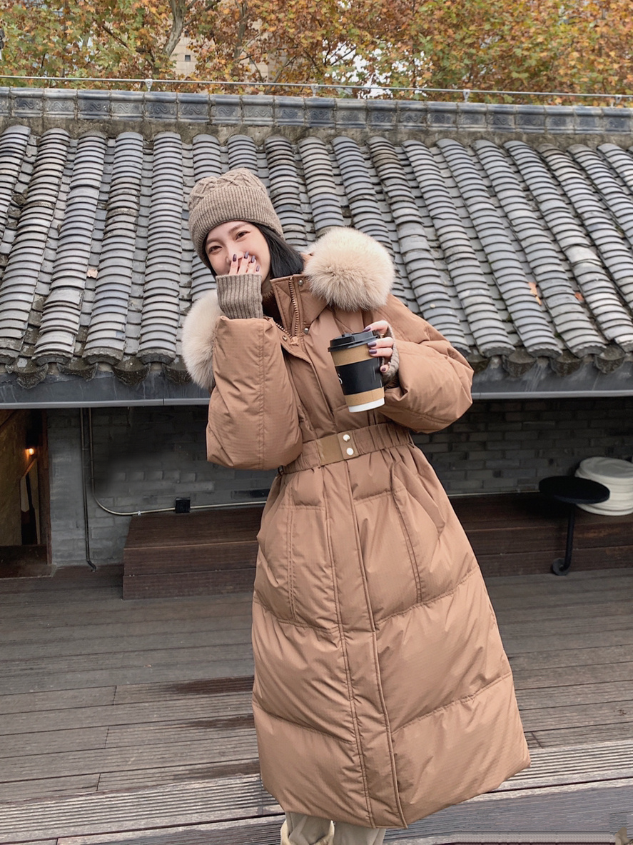 如果想要更加保暖的話,還可以在外面套上一件卡其色的長款毛領羽絨服,這種同色系的搭配讓整個人非常有氣質,透露出清冷的高級架式,有一種他人無法超越的優越感。