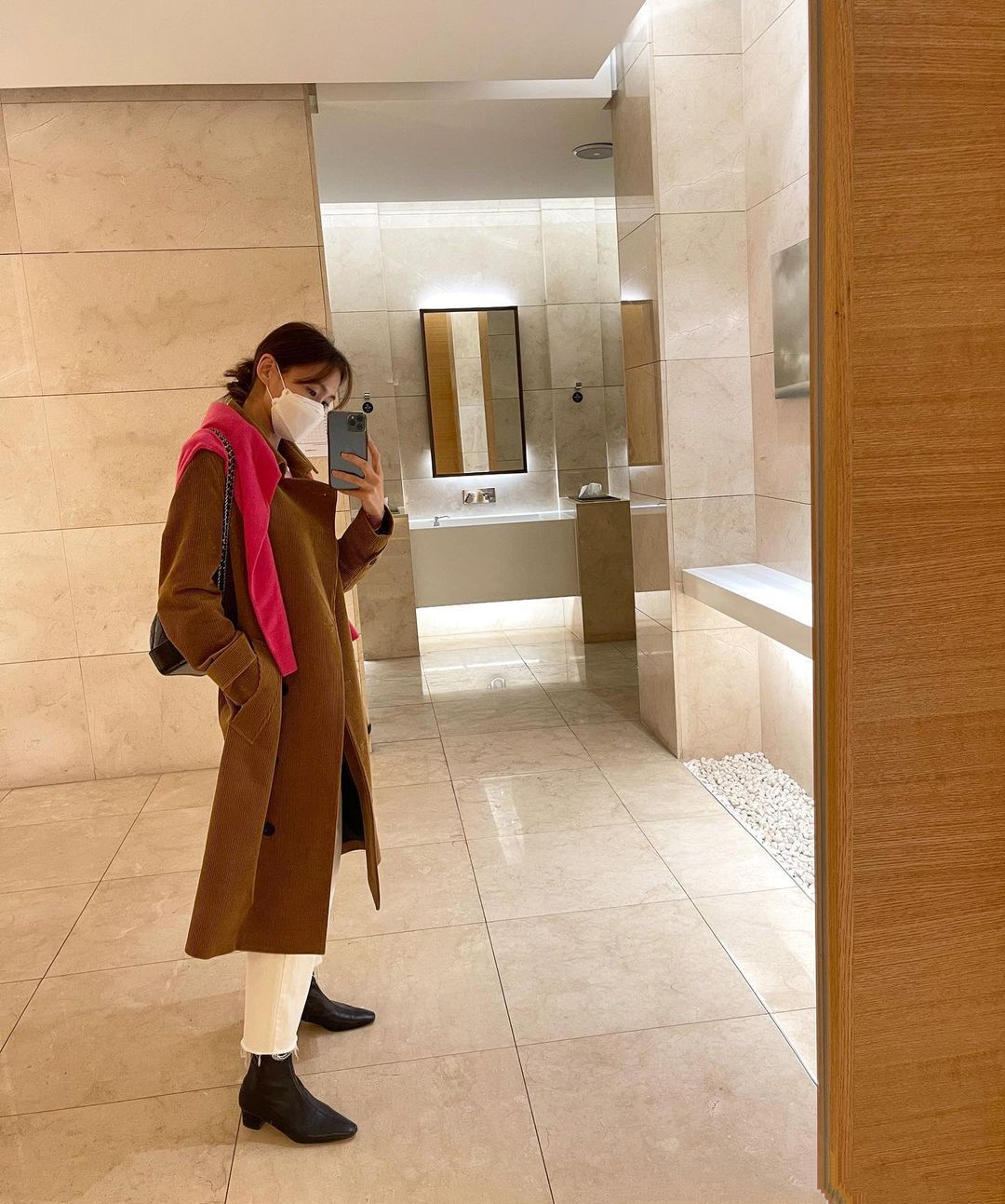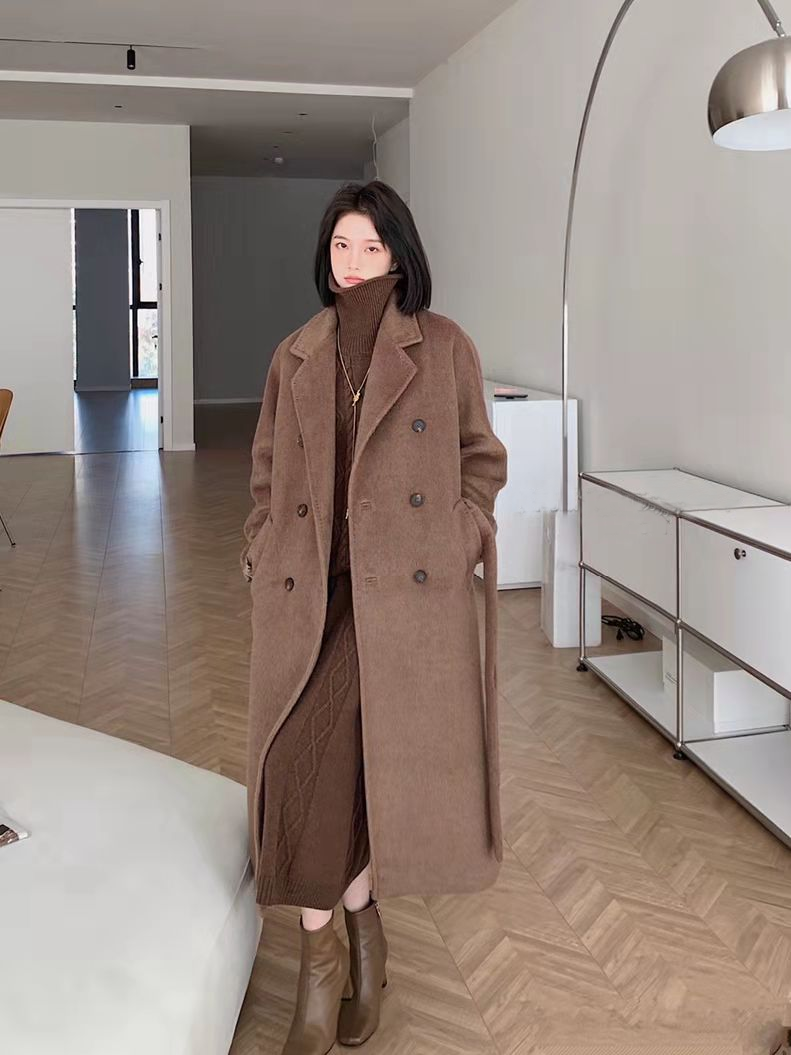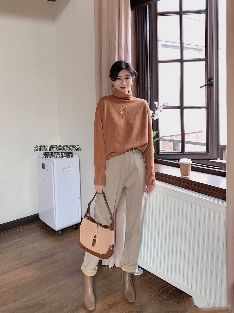 這種低飽和度色系的大衣早就成為了秋冬彰顯大氣的必備單品之一,內搭選擇了更具明亮的焦糖色高領毛衣和直筒褲。整體棕色系的風格,內外顏色有著對比,不會太突兀,時髦又大氣。