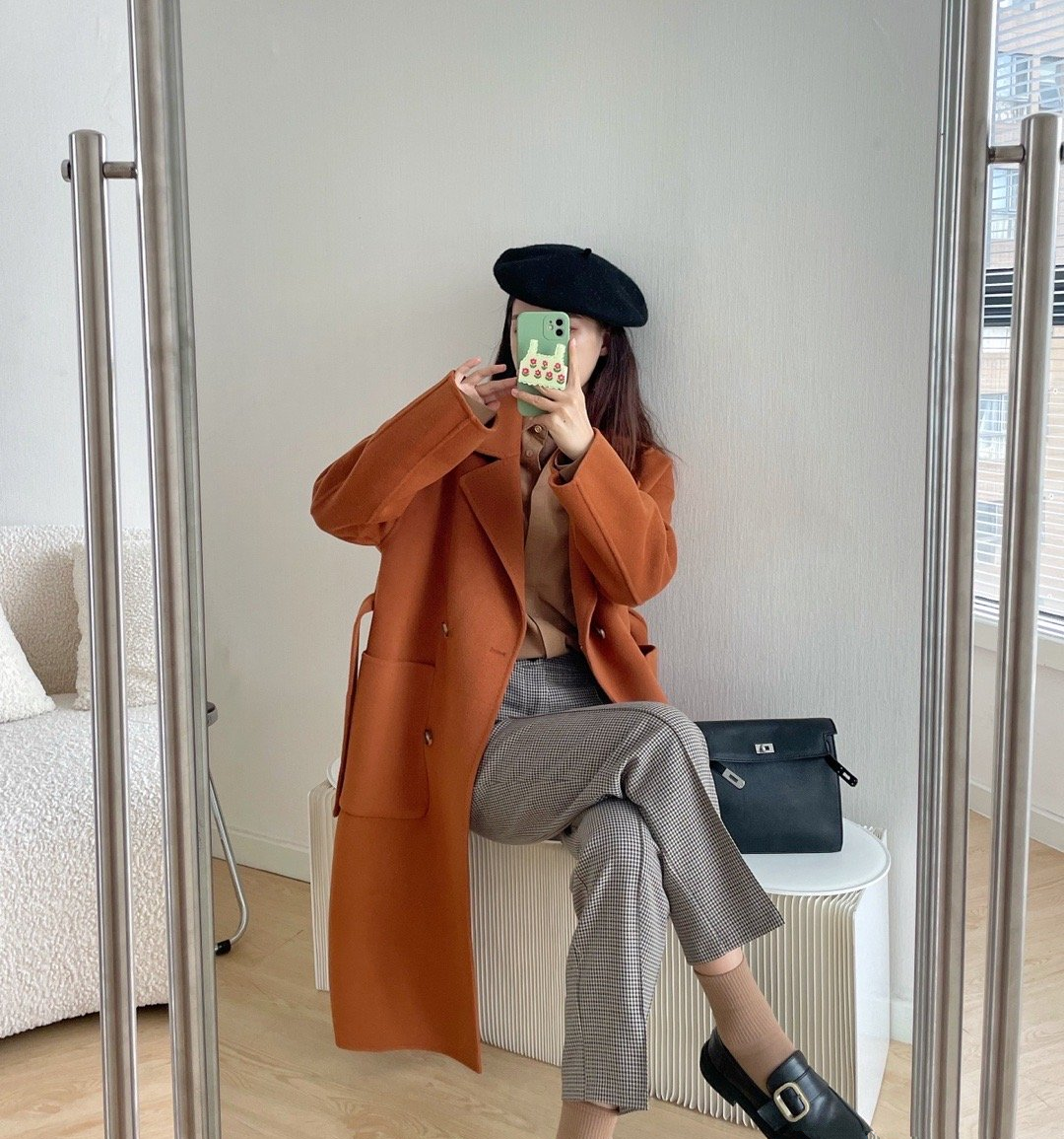 飽和度較高的焦糖色大衣,穿在身上明艷動人,非常提氣色,然而這種亮色系的大衣,配色方面更需要簡單大氣,避免多而繁雜的色系搭配,才可以凸顯出不一樣的高級氣場。下身搭配低飽和度的淺灰色格紋褲,復古又具有幹練感。