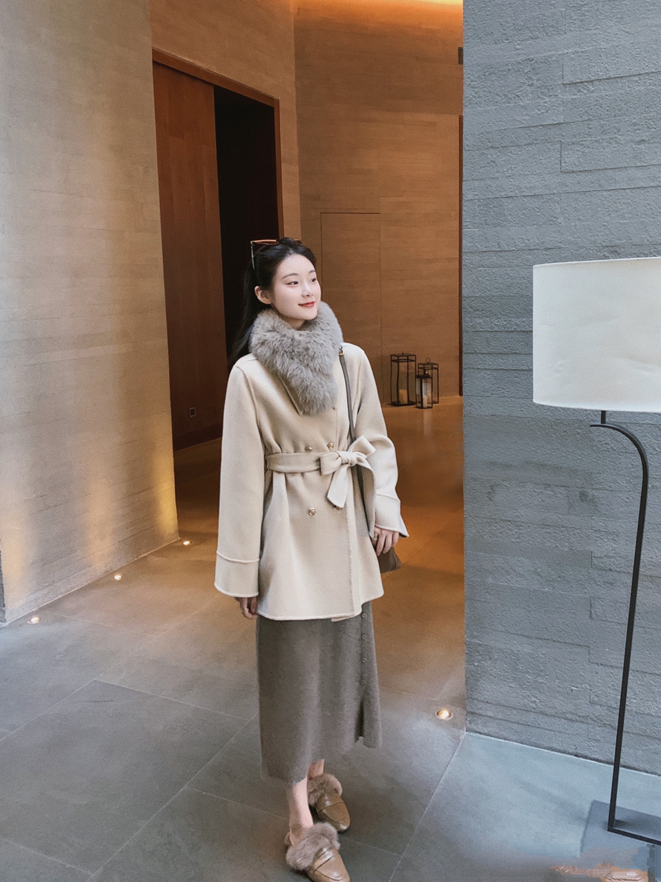 卡其色本身看上去就飽和度不高,屬於溫柔之性的顏色,下半身配上質樸低調的淺灰色針織半裙,更顯成熟穩重。領口搭配的灰色貂毛圍巾,無疑彰顯著貴婦氣質,和腳上的毛毛拖鞋形成了呼應。
