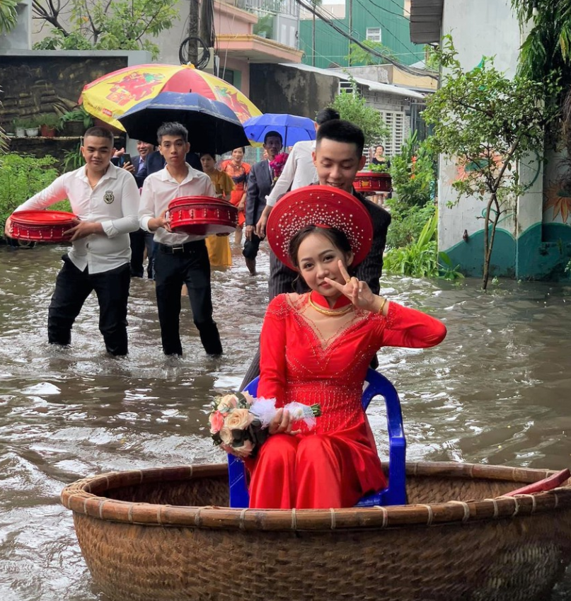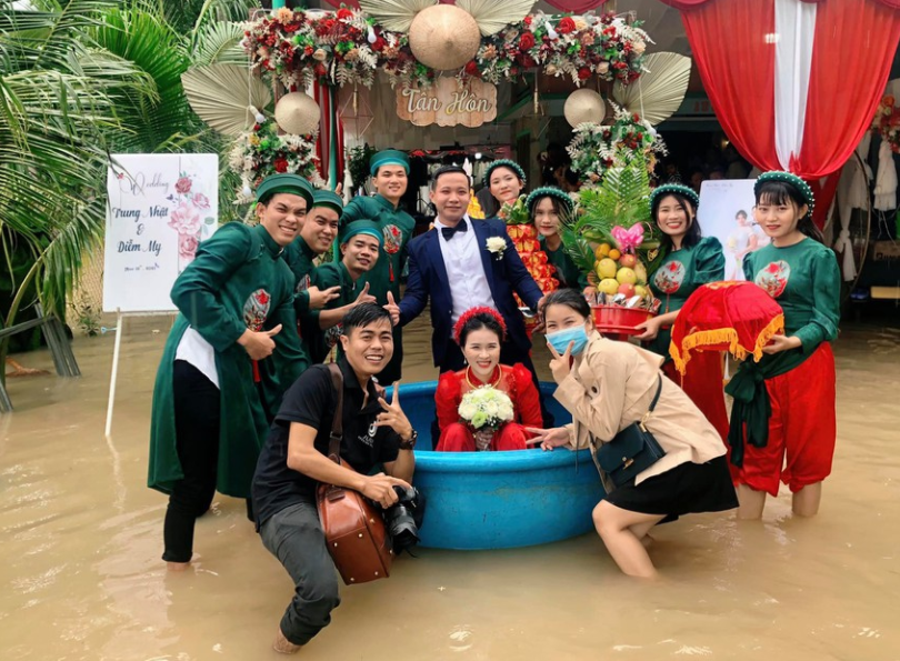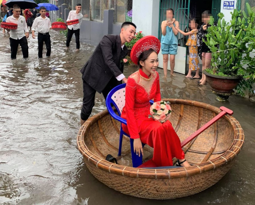 11月15日,新郎中日和阿美舉行婚禮,當天兩點多,新郎迎親回家,但由於延續三天的暴雨和洪水,家門口有一段路積水已經很深,婚車無法通過,見狀新郎很快就想了一個好辦法:讓人從家裡拿來一個大盆,新娘坐在盆中,新郎和伴郎伴娘們像劃船一樣把新娘推回了家。
