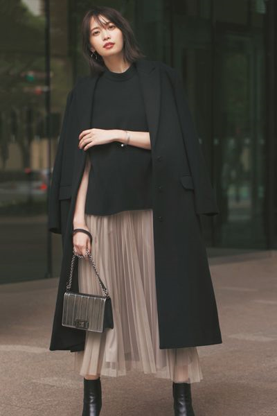 例如黑色長款大衣,搭配褶皺款半身裙,這種風格看起來會更有少女感,但是又保留了女生的優雅氣質,整個人看起來更加得體。