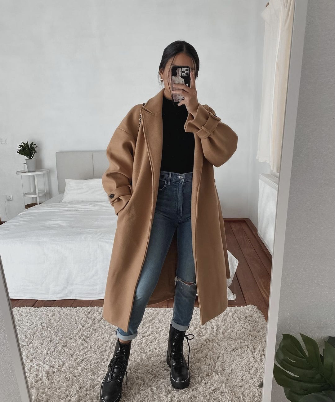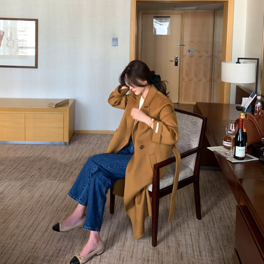 可能有些女生,並不喜歡搭配修身款牛仔褲,就可以嘗試直筒款牛仔褲,這種褲子反而會更加大氣,結合駝色大衣,可以展現出優雅的氣質。