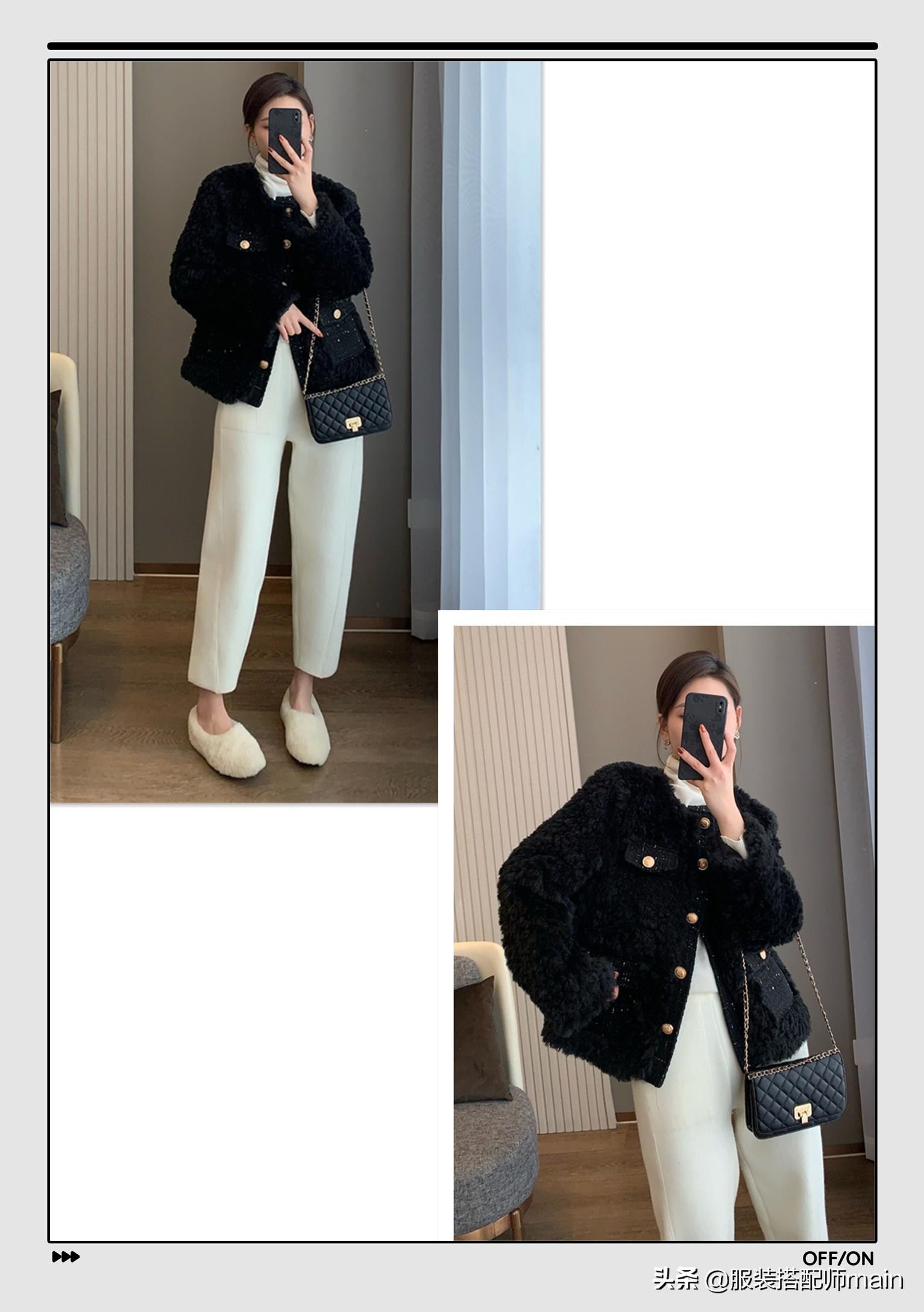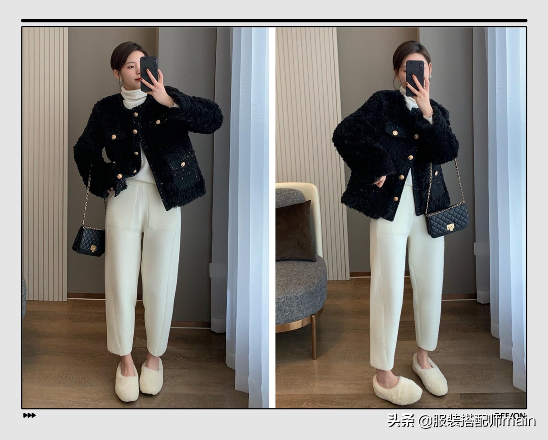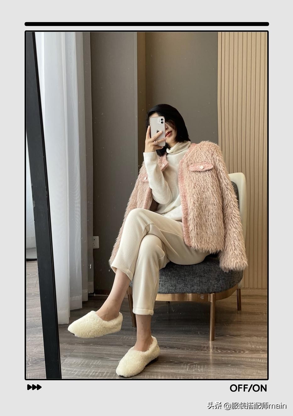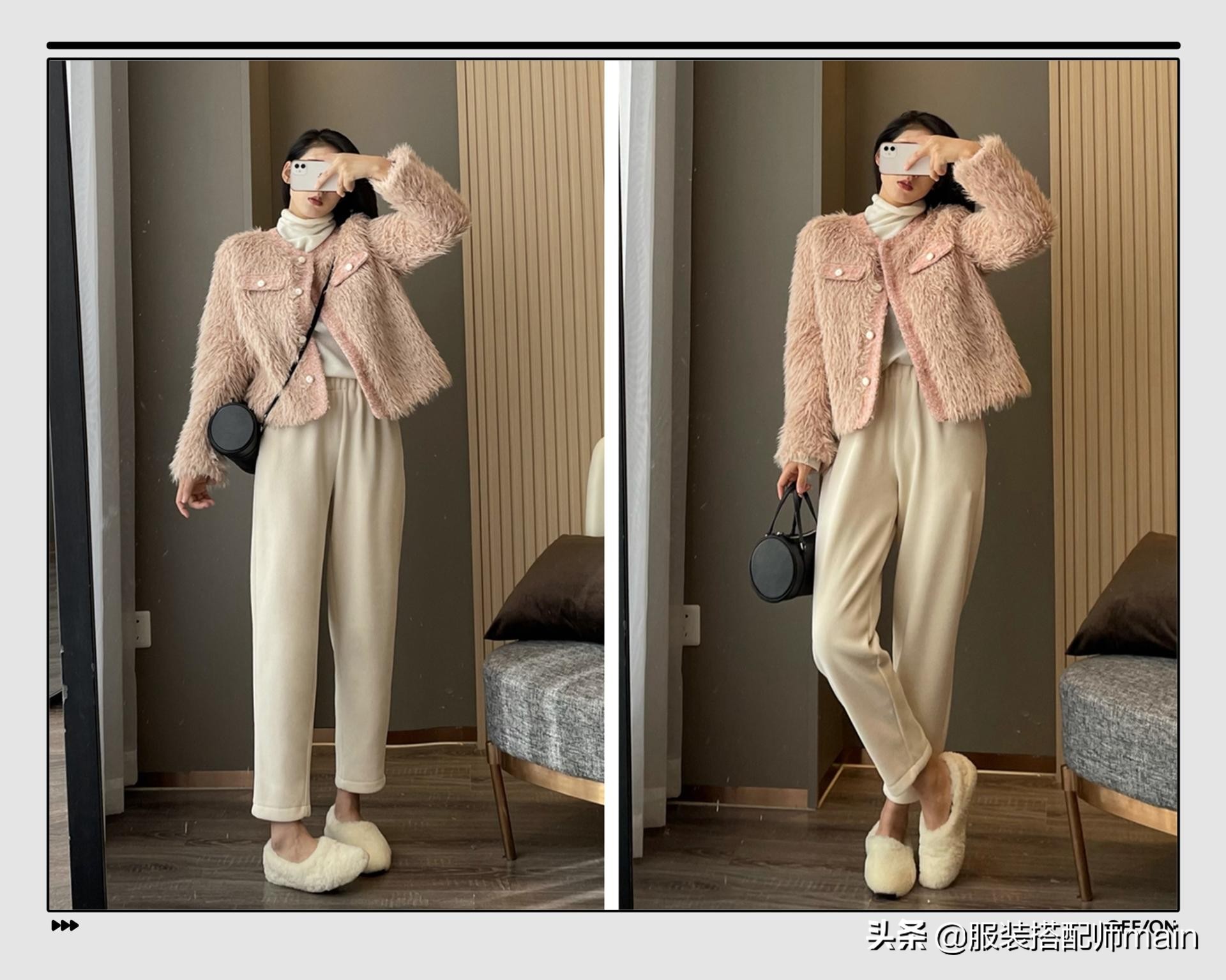 這樣的小香風外套也非常適合搭配豆腐褲。毛絨的外套和腳上的毛毛鞋還可以上下呼應呢。
