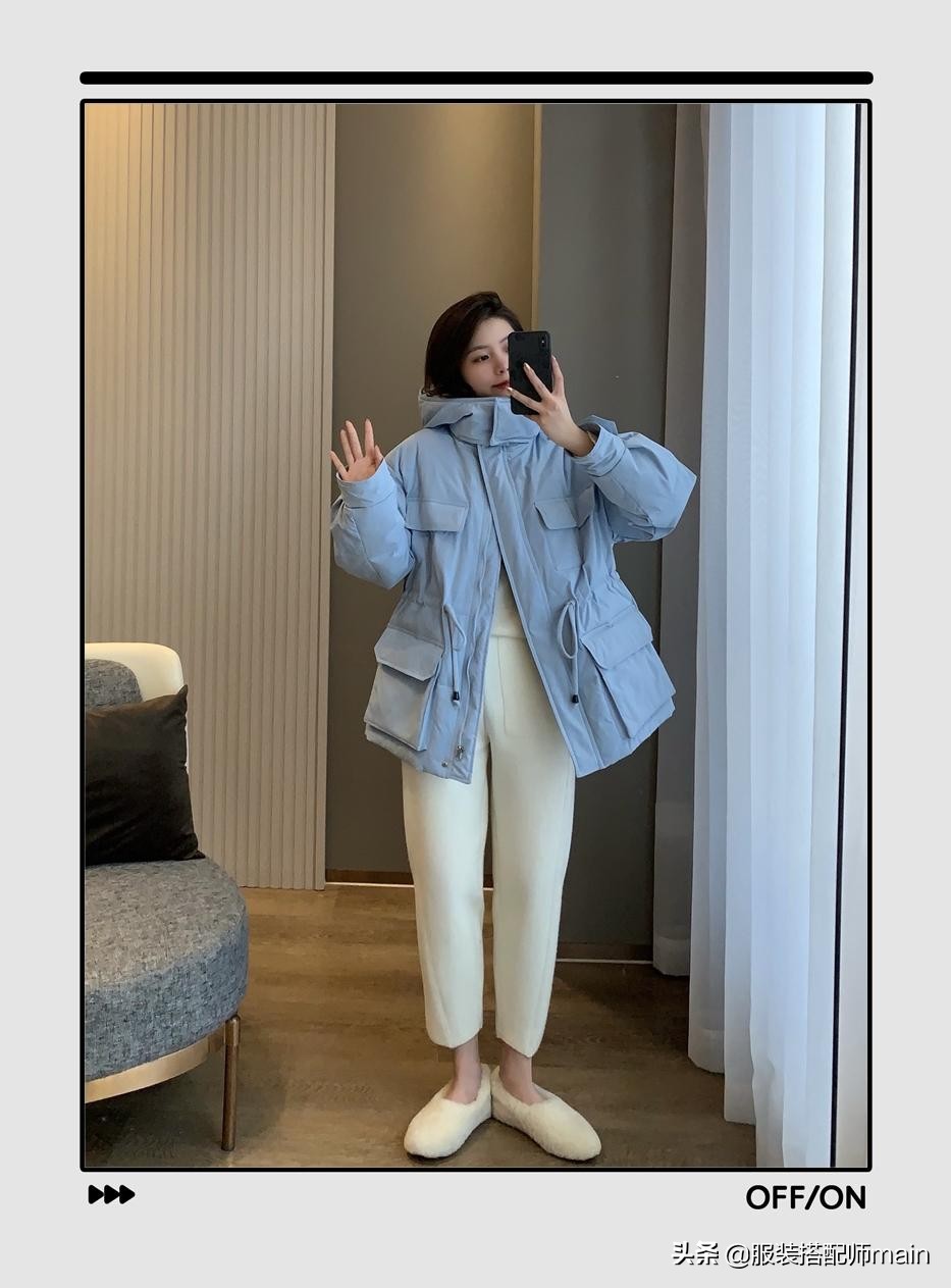 除了黑白配組合外,搭配豆腐褲可以試試淺藍色,給人一種活潑清純的感覺。拉緊羽絨服的抽繩,一樣能穿出好的身材比例。