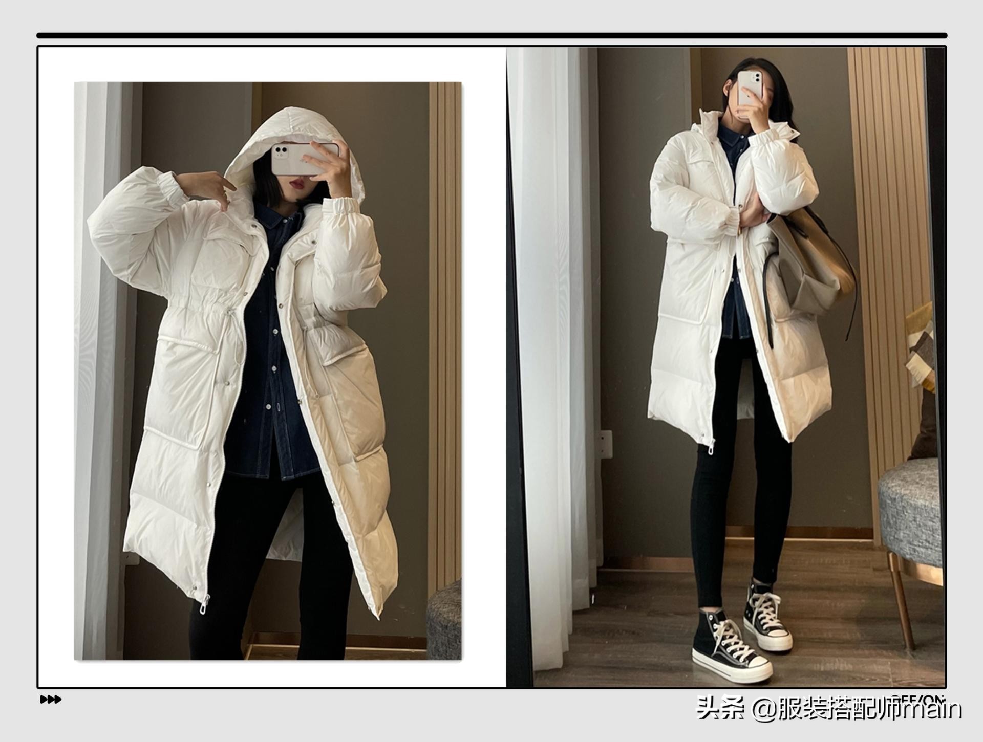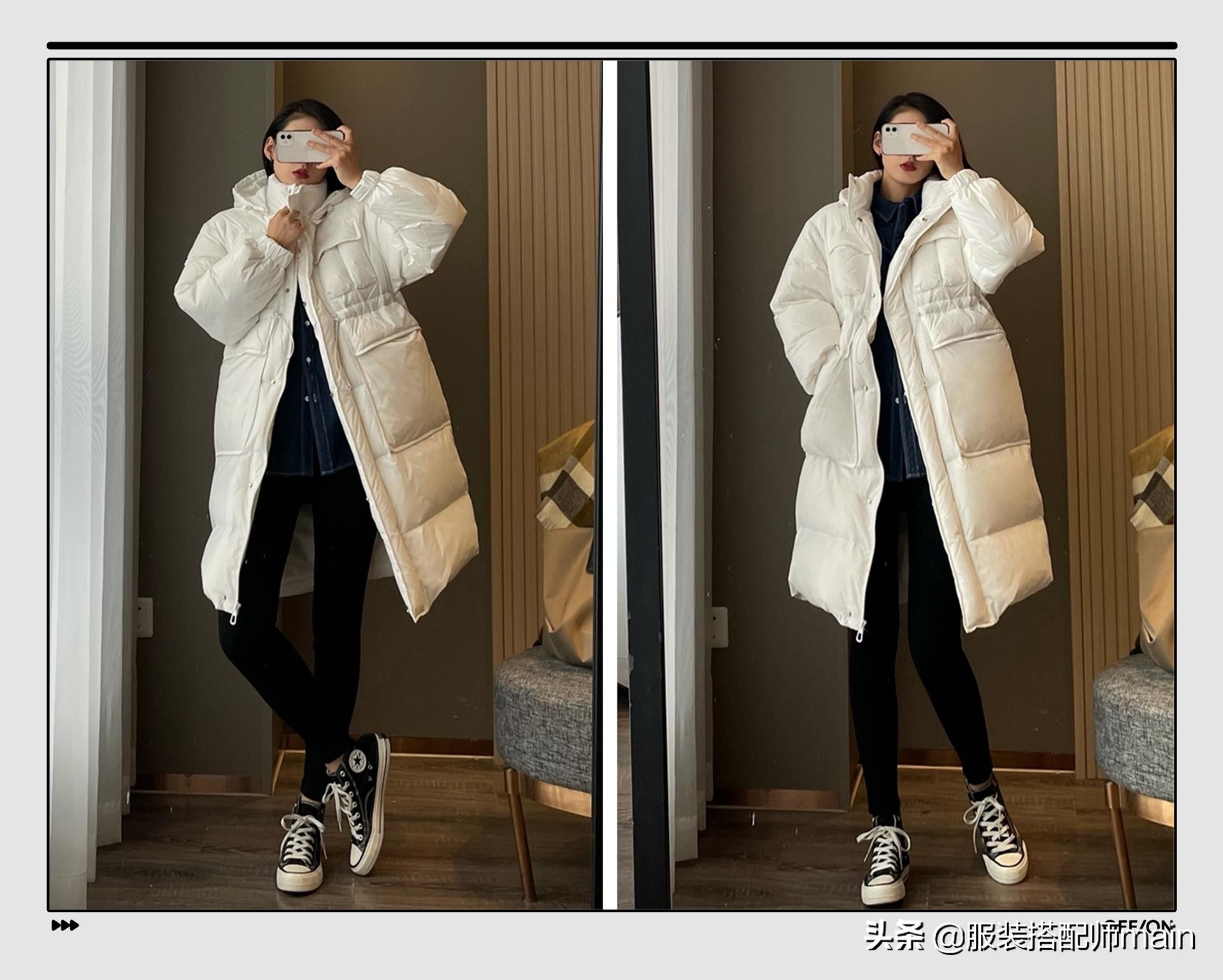 搭配中長款的白色羽絨服,還是黑色緊身褲最適合,除了是經典的「黑白配」,還呈現出了「上松下緊」的效果,顯瘦專用。