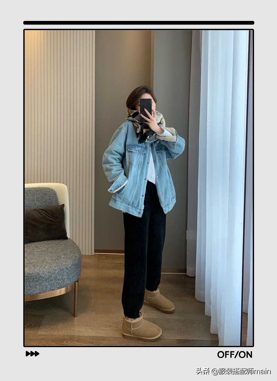 搭配運動褲穿,潮流范十足,腳上的雪地靴是保暖的保障,再降溫就不怕了。