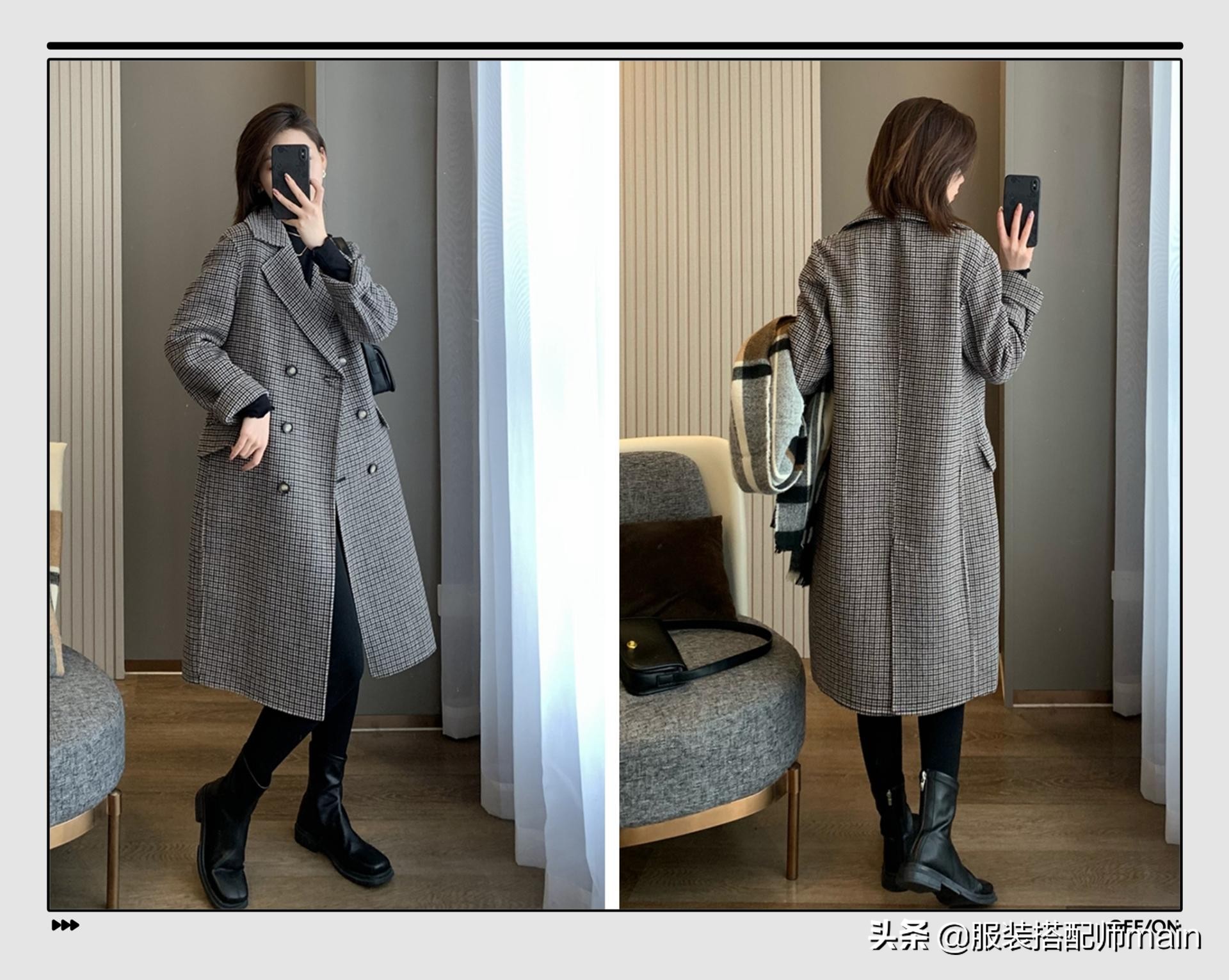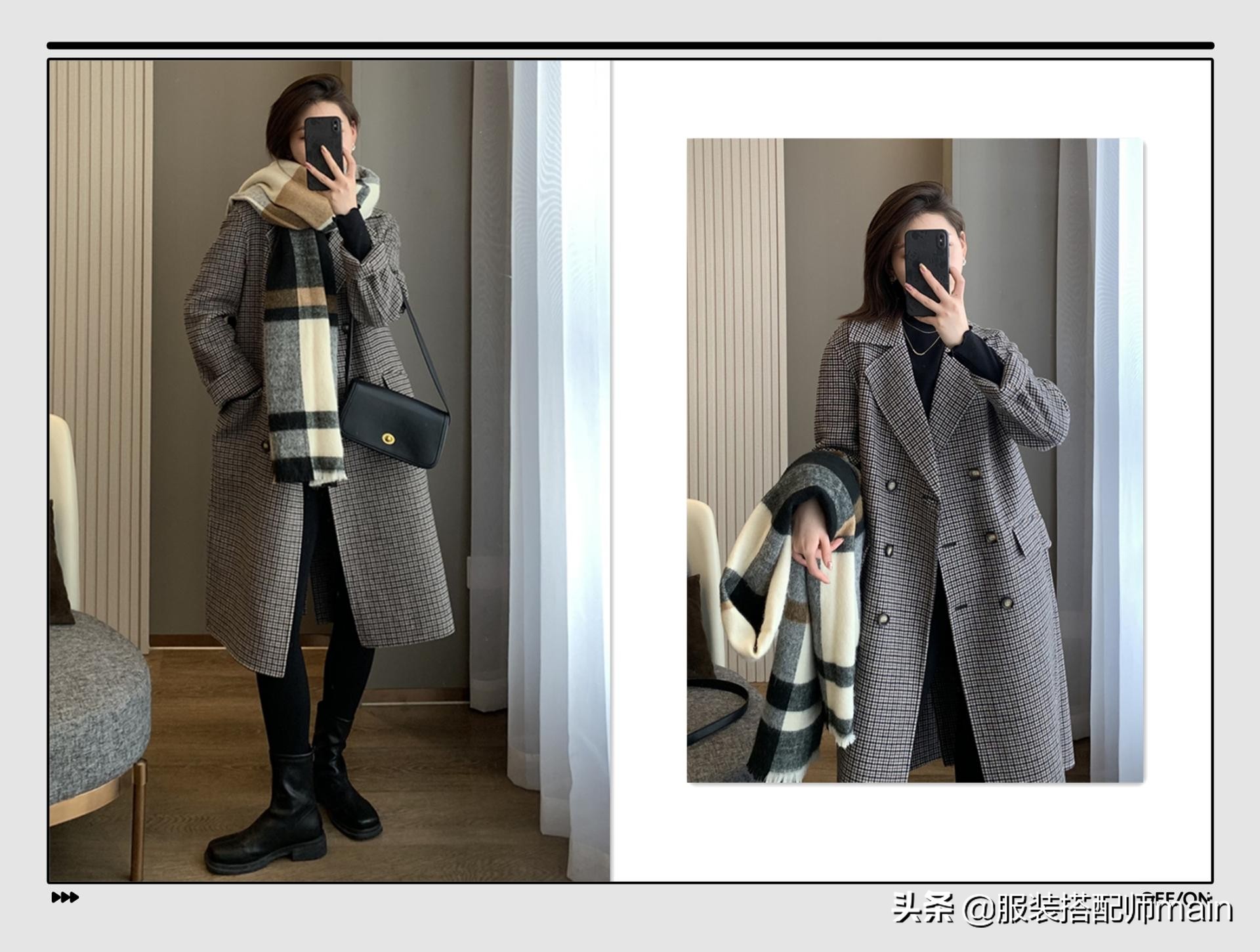 這件格紋大衣是標準的直筒版型,首先包容性強,再有就是很幹練的感覺。與小黑褲和馬丁靴的組合小個子女生穿也不會顯矮。