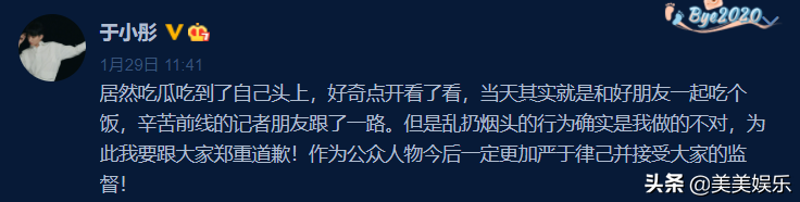 不過,緋聞上熱搜後,於小彤很快出來否認澄清,稱對方只是好朋友,並為亂扔煙頭的行為道歉。