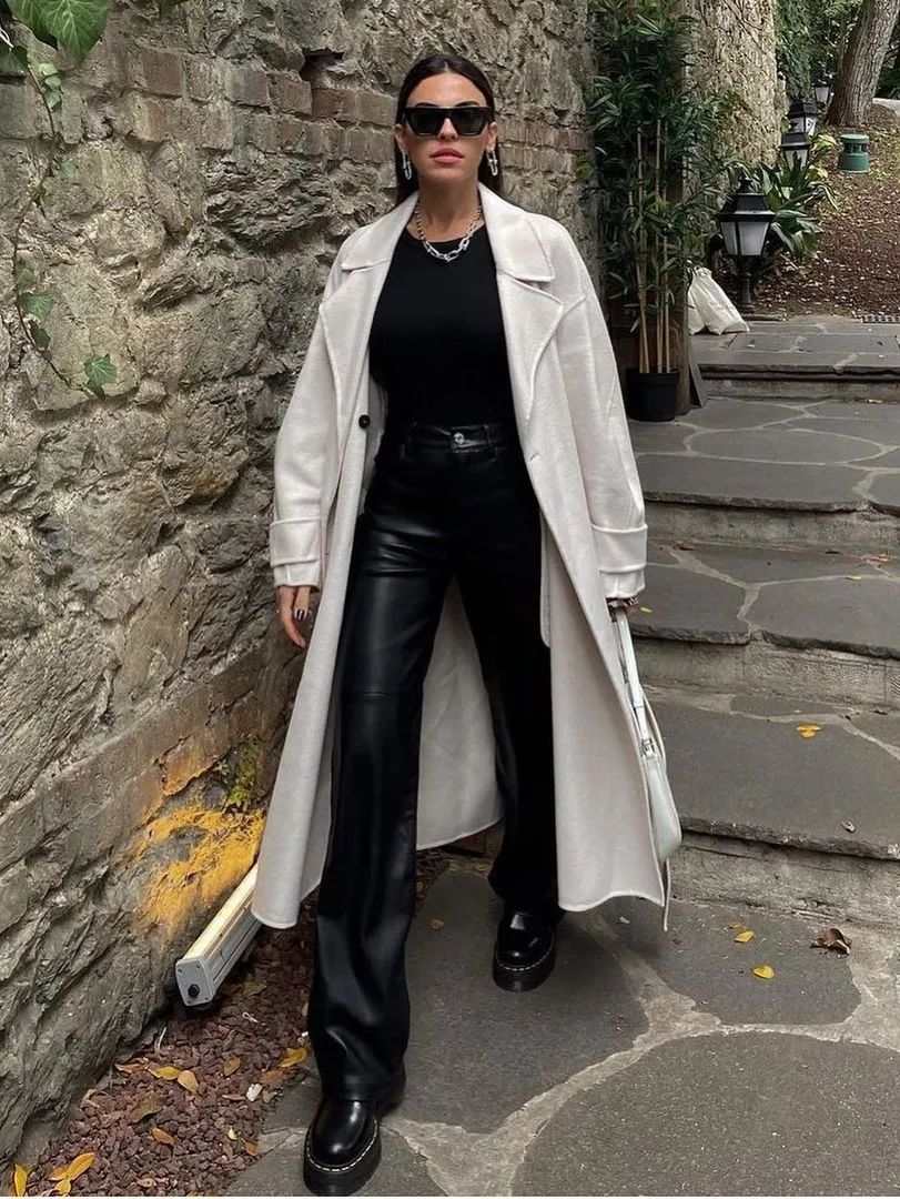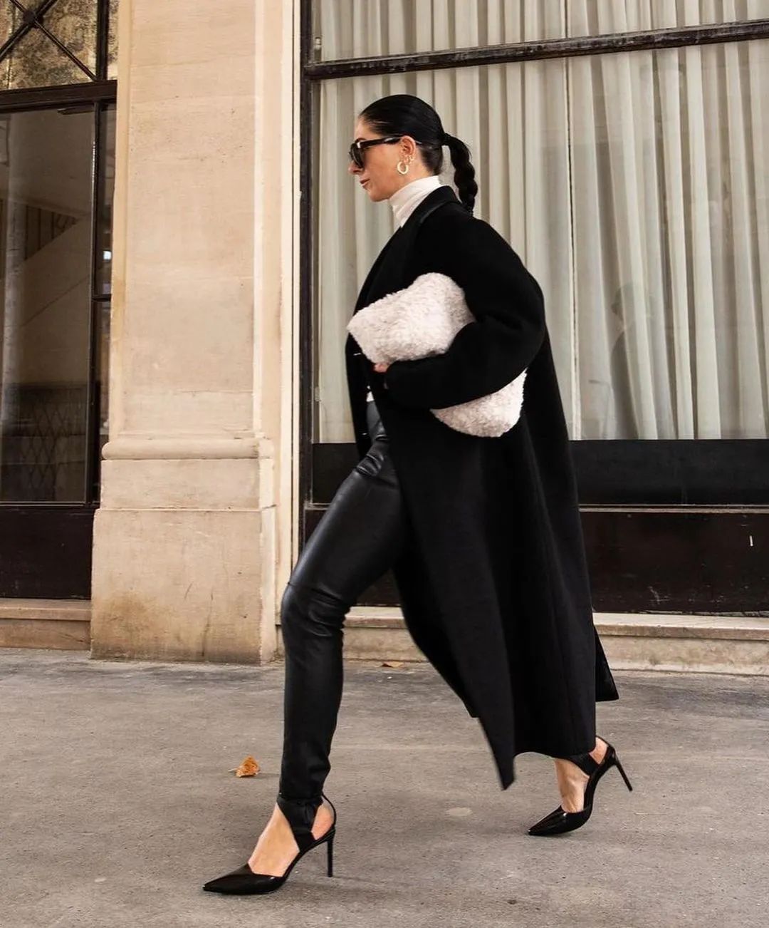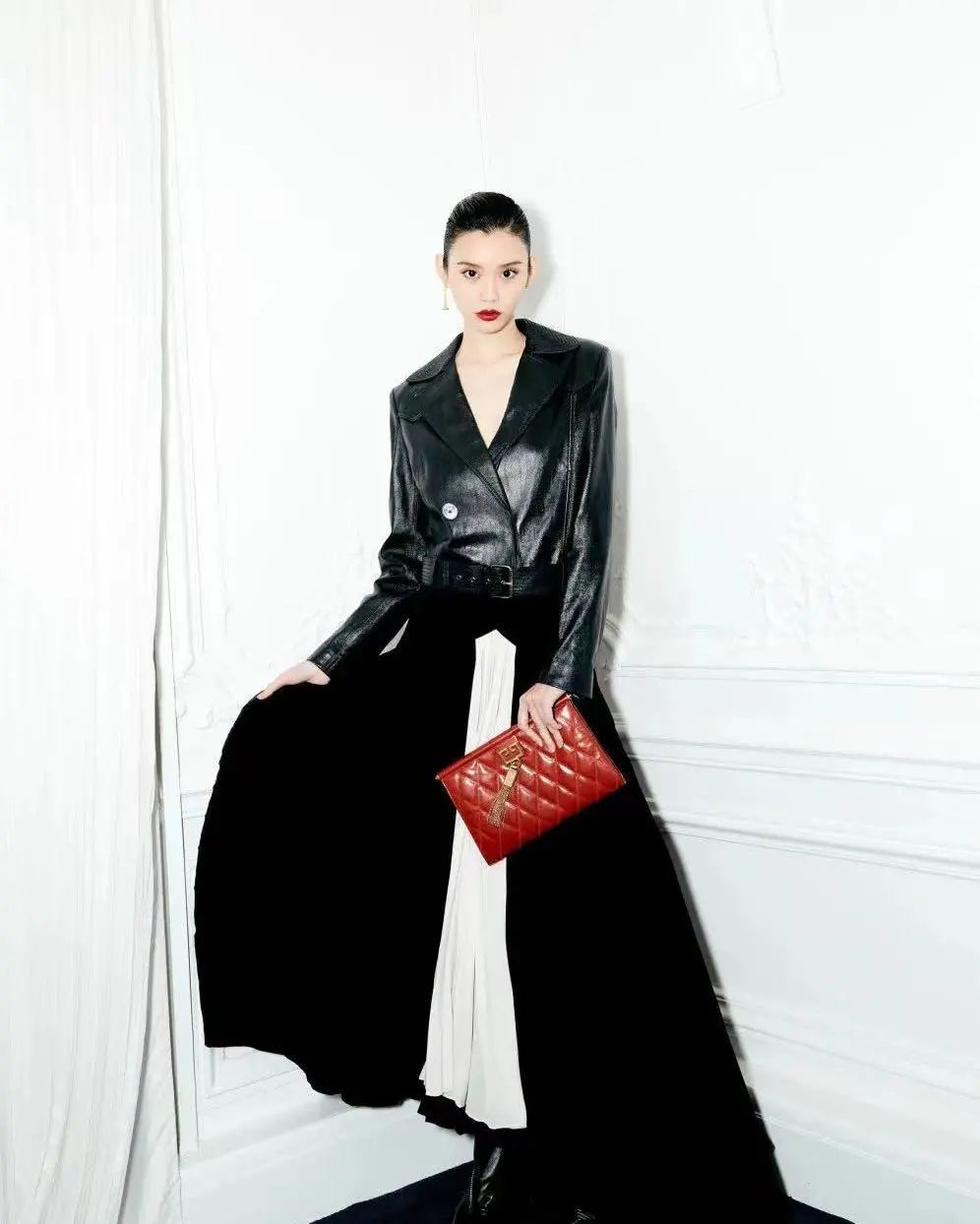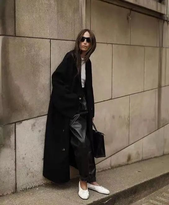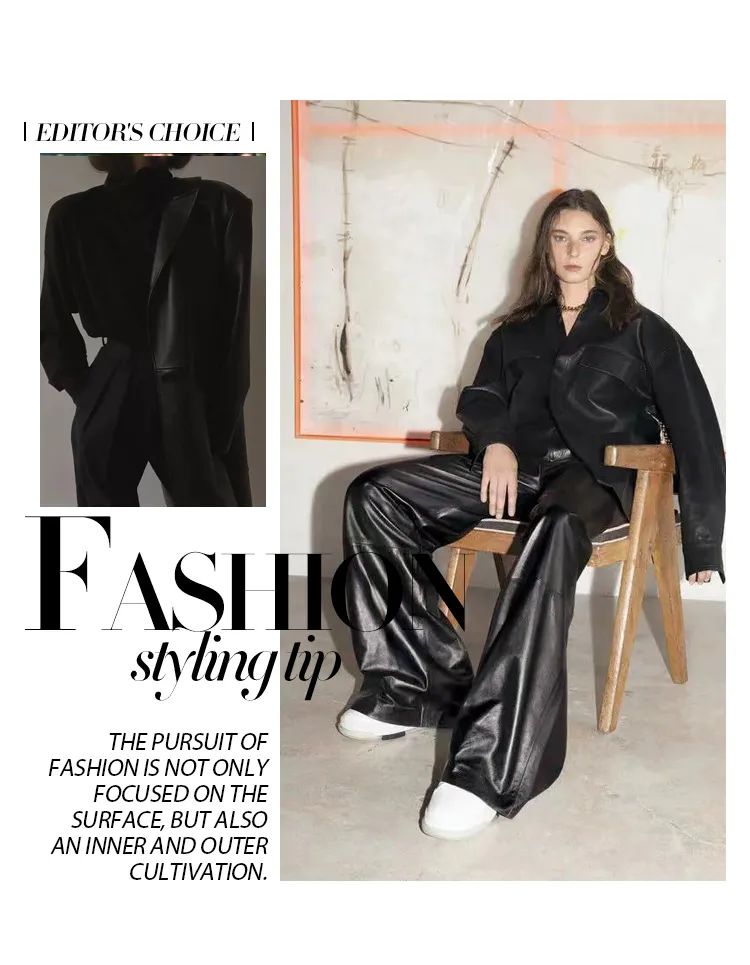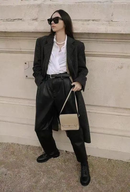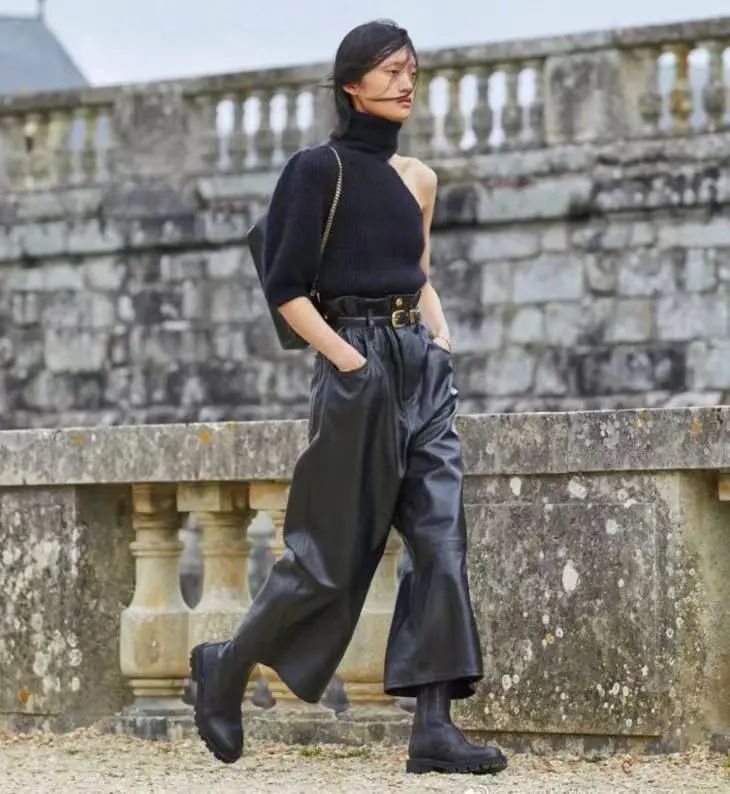 黑色部分像是帶有光澤感的皮革、真絲等材質,能讓整體look立刻亮一度,通過材質的不同質感便能打破沉悶,更凸顯層次。