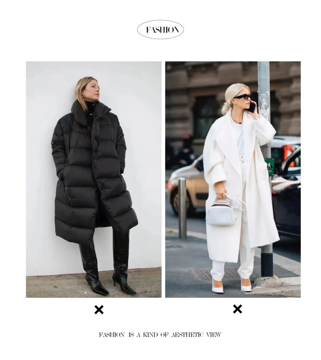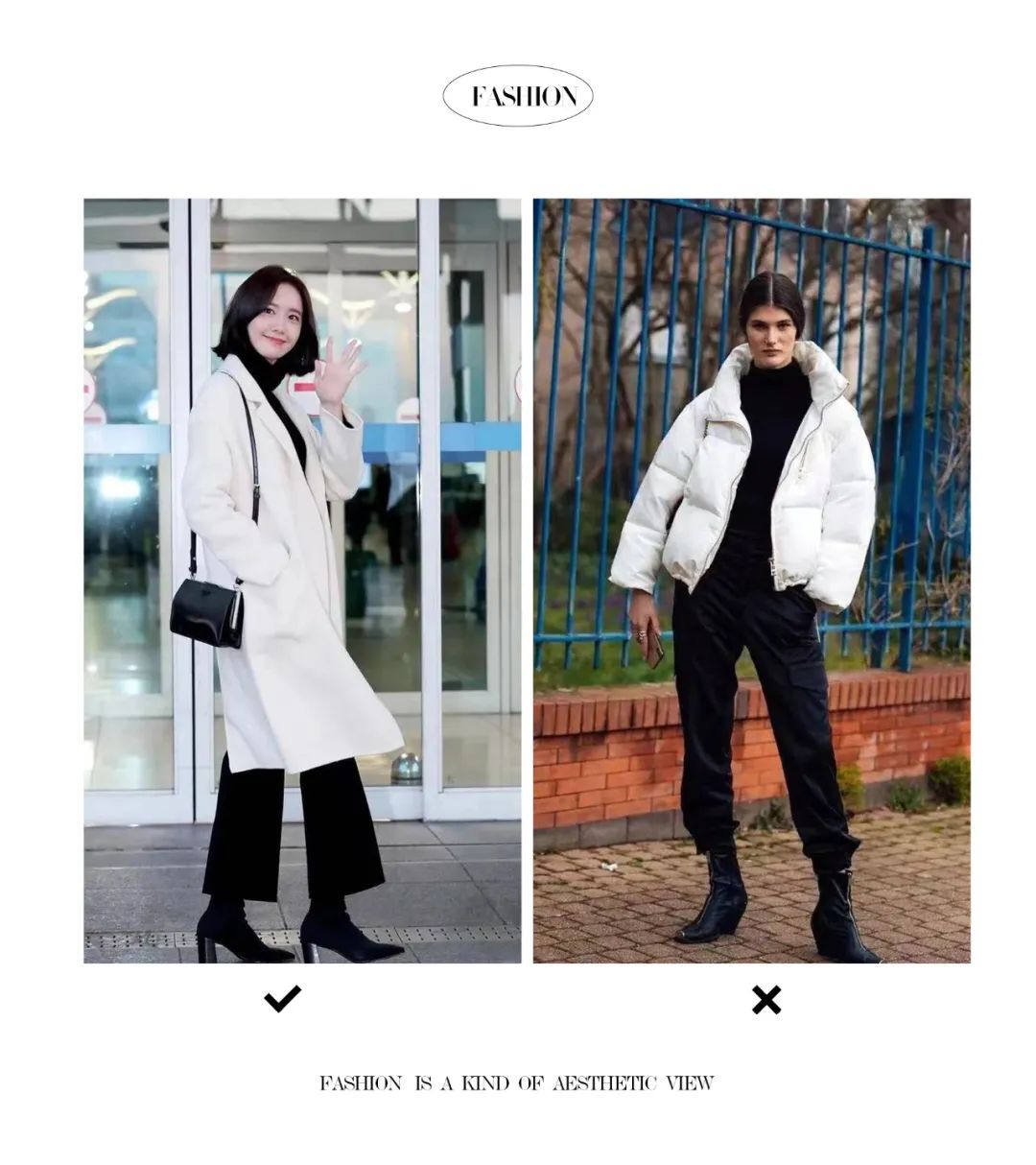 但到了秋冬,裹上厚厚的外套,大面積的黑白色便很容易將人淹沒。如果不能露胳膊露腿,最好的辦法便是將黑白的比例拿捏好。