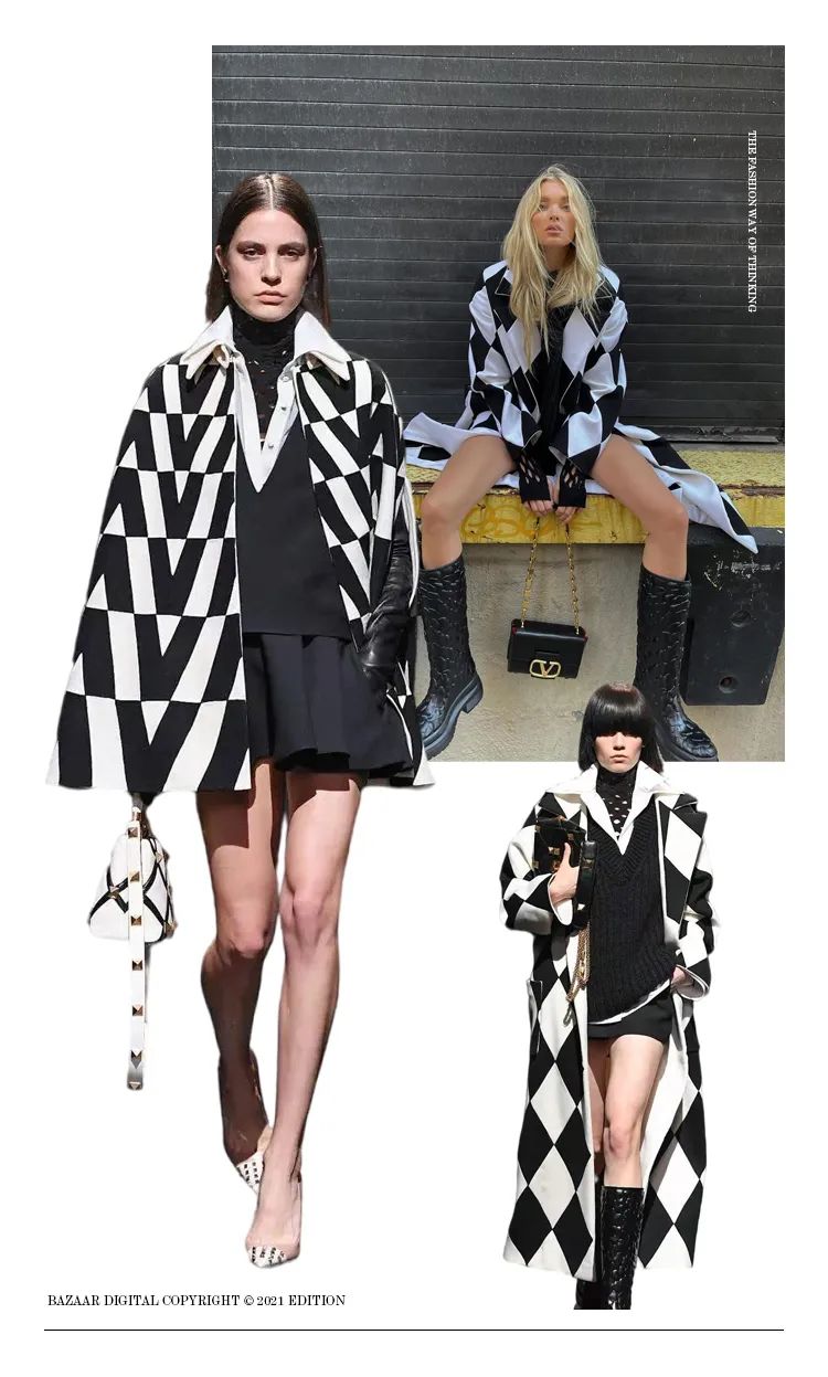 Valentino 2021秋冬系列就大量運用了這個思路。顛覆傳統的黑白拼色組合,將品牌標誌融入到印花之中。