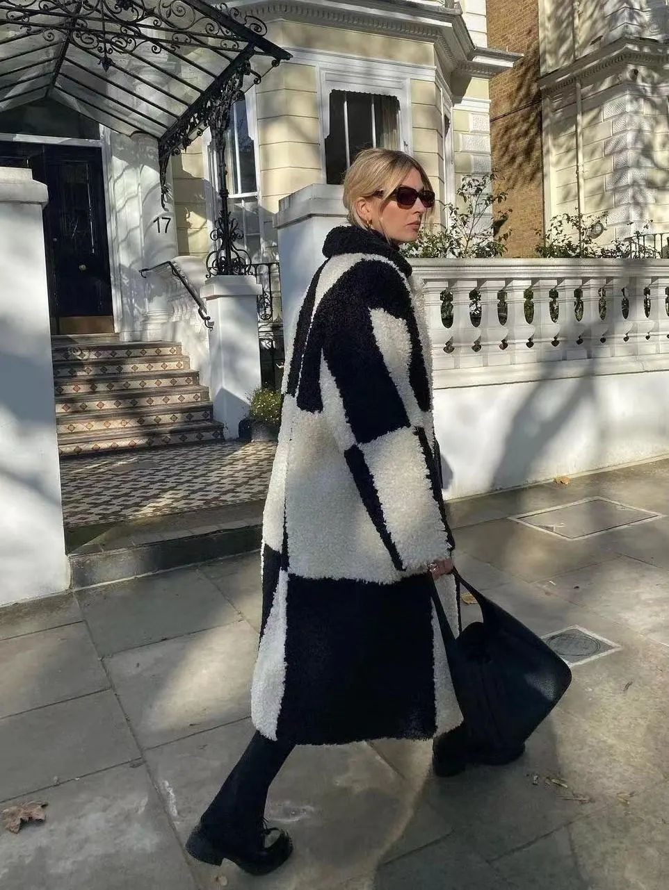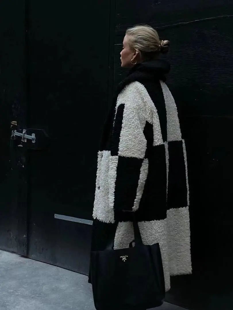 秋冬可以試試這種黑白棋盤格的毛絨外套,不僅足夠溫暖,也顯得設計感十足。