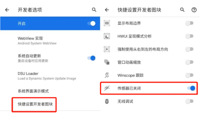 首先開啟手機的【開發者模式】,接著選擇【快捷設置開發者圖塊】中,最後勾選【傳感器已關閉】選項就搞定了。