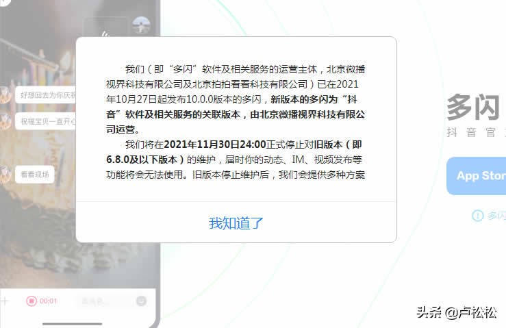 我們(即「多閃」軟體及相關服務的運營主體,北京微播視界科技有限公司及北京拍拍看看科技有限公司)已在2021年10月27日起發布10.0.0版本的多閃,新版本的多閃為「抖音」軟體及相關服務的關聯版本,由北京微播視界科技有限公司運營。