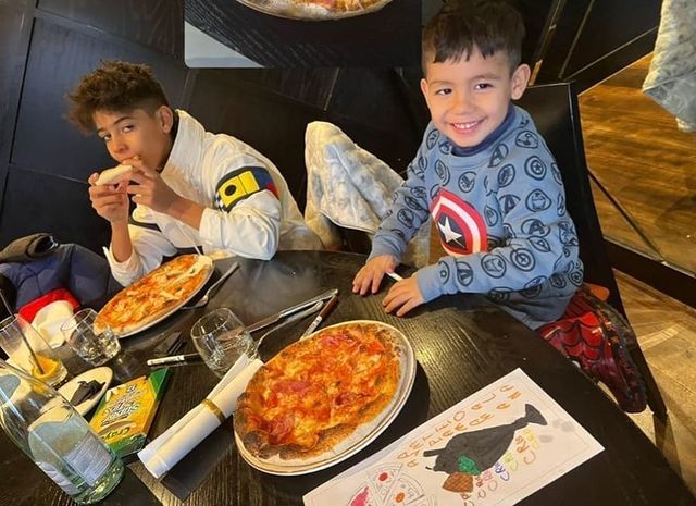 公園玩雪結束之後,母女五人進入了一家義大利餐廳,萌娃們邊吃飯邊畫畫,還不忘在媽媽拍照時留下燦爛的笑容。不得不說,阿拉娜·瑪蒂娜的一頭小捲髮跟他爸爸C羅小時候還真是一模一樣。