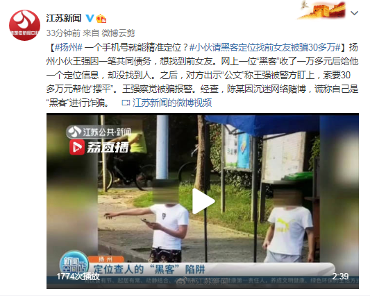 【#揚州# 一個手機號就能精準定位?#小夥請駭客定位找前女友被騙30多萬#】揚州小夥王強因一筆共同債務,想找到前女友。網上一位「駭客」收了一萬多元後給他一個定位資訊,卻沒找到人。之後,對方出示「公文」稱王強被警方盯上,索要30多萬元幫他「擺平」。王強察覺被騙報警。經查,陳某因沉迷網路賭博,謊稱自己是「駭客」進行詐騙。