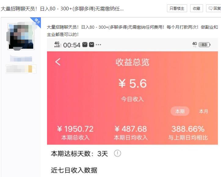 「大量招聘聊天員!日入80-300元+(多聊多得)無需繳納任何費用!每個月打款兩次!做副業和主業都是可以的!」「招聘聊天員(限女生)在我們平臺上跟陌生人聊天,用文字,語音,視訊等方式進行聊天,聊天內容由自己,只要不聊違法的就行。」po文人留下聯絡方式之餘,通常還亮出收益豐厚的截圖。