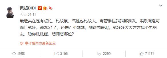 7月17日,靈超深夜發文懟私生女友粉:「最近實在是有點忙,比較累,氣性也比較大,甭管誰攔我我都要發,娛樂呢適可而止就好,都2021了,還來?小妹妹,想談戀愛呢,就好好大大方方找個男朋友,勸你洗洗睡,想問您哪位? 」