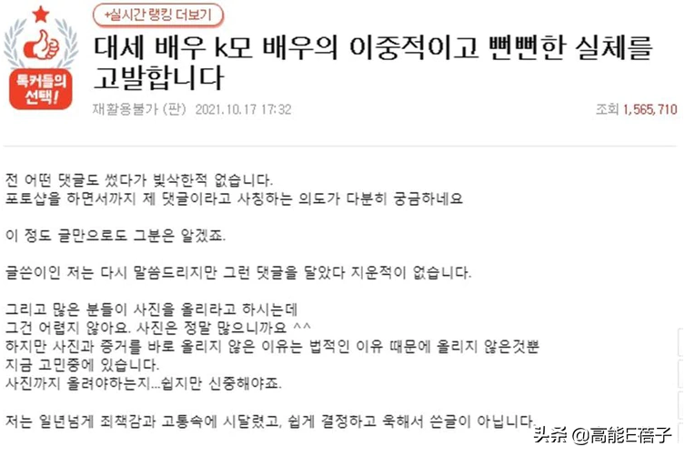 17日,有韓國網友在韓網nate pann發表了一則題為《我要曝光大勢演員K某反差及厚顏無恥的真面目》的帖子,爆料大勢男演員K某以自己紅了為由,單方面分手並強迫她墮胎,還在背後批判一起合作的演員、導演。