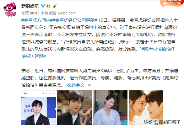 19日,據韓媒,金宣虎經紀公司相關人士回應稱:「正在核實匿名帖子爆料中的事實中。對於事前沒有進行順利溝通的這一點表示道歉,今天將發布立場文。因這種不好的事情讓大家擔心,對此向各位致以誠摯的歉意。」