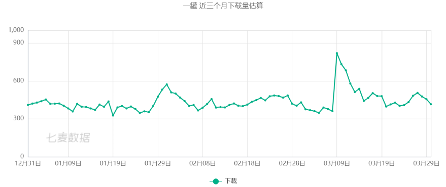七麥數據顯示,從2019年11月起,一罐App iOS版共進行了6次更新,如此頻繁的產品更新,並未對提升產品用戶量。最近三個月內,一罐App在App Store內的日均預估下載量不足1000次,從2019年12月31日2020年3月31日的累計下載量為39684,其三個月的累計下載量甚至不如頭部App一天的下載量。一罐App最近三個月在社交免費榜中從未進入到排名前100以內。