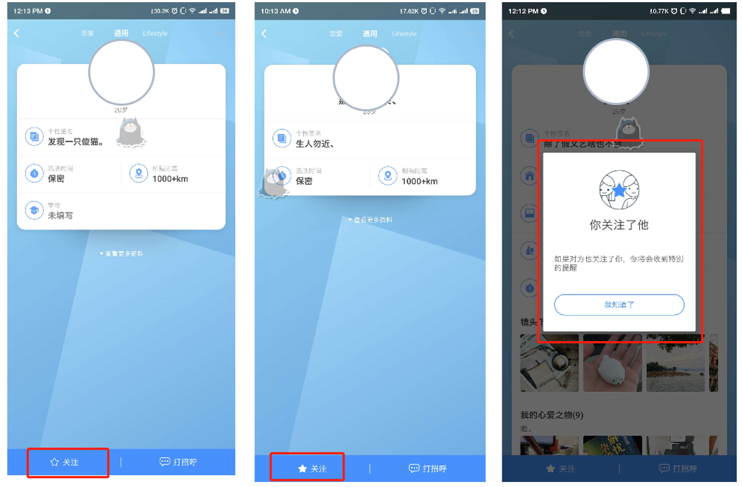 邏輯:點擊關註,按鈕狀態轉換,正常無任何提醒(只有第一次app使用此功能才會有彈窗提醒),再次點擊取關,小星星狀態轉換,也沒有任何提醒。功能設計簡單,不知道在這裡的設計上,是不是考慮到一點,交流對象變更比較頻繁,不想帶給人更多的束縛感,所以就沒有設置特別的提醒。