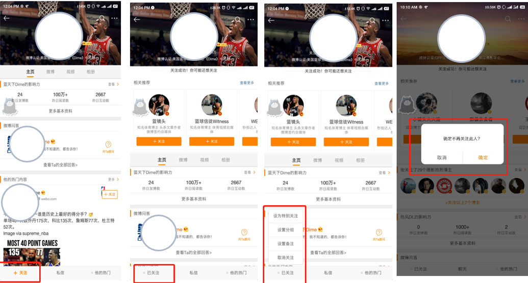 邏輯:點擊關註之後,按鈕轉變為已關註,並沒有其他提示,當點擊已關註,會彈出列表-「特別關註」,「設置分組」,「設置備註」,「取消關註」,點擊取消關註彈窗是否確定取關,確定之後才會取消關註。由此可見,取消關註藏的還是很深,且操作流程較多。