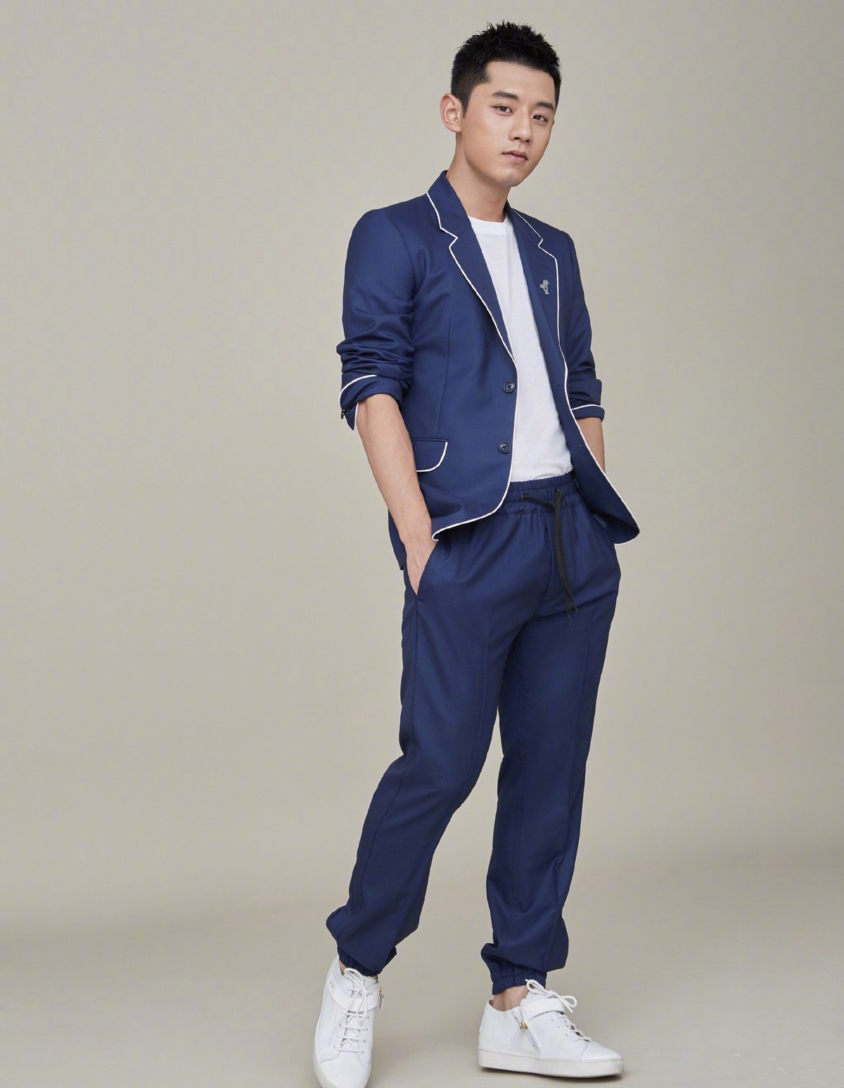 西裝版型是男士搭配中最為常見的一種款式,但它所塑造出的風格未必總是端莊儒雅的,張繼科所選擇的墨藍色西裝配合休閒T恤與小白鞋,就看起來相當具有潮流感,整個人盡顯輕鬆隨意。
