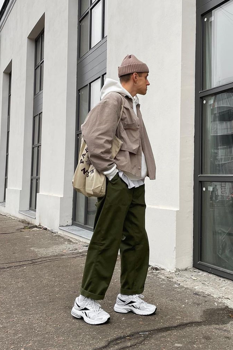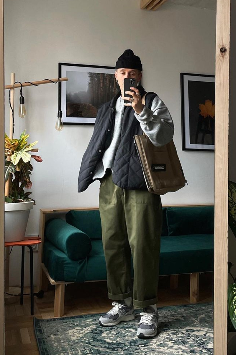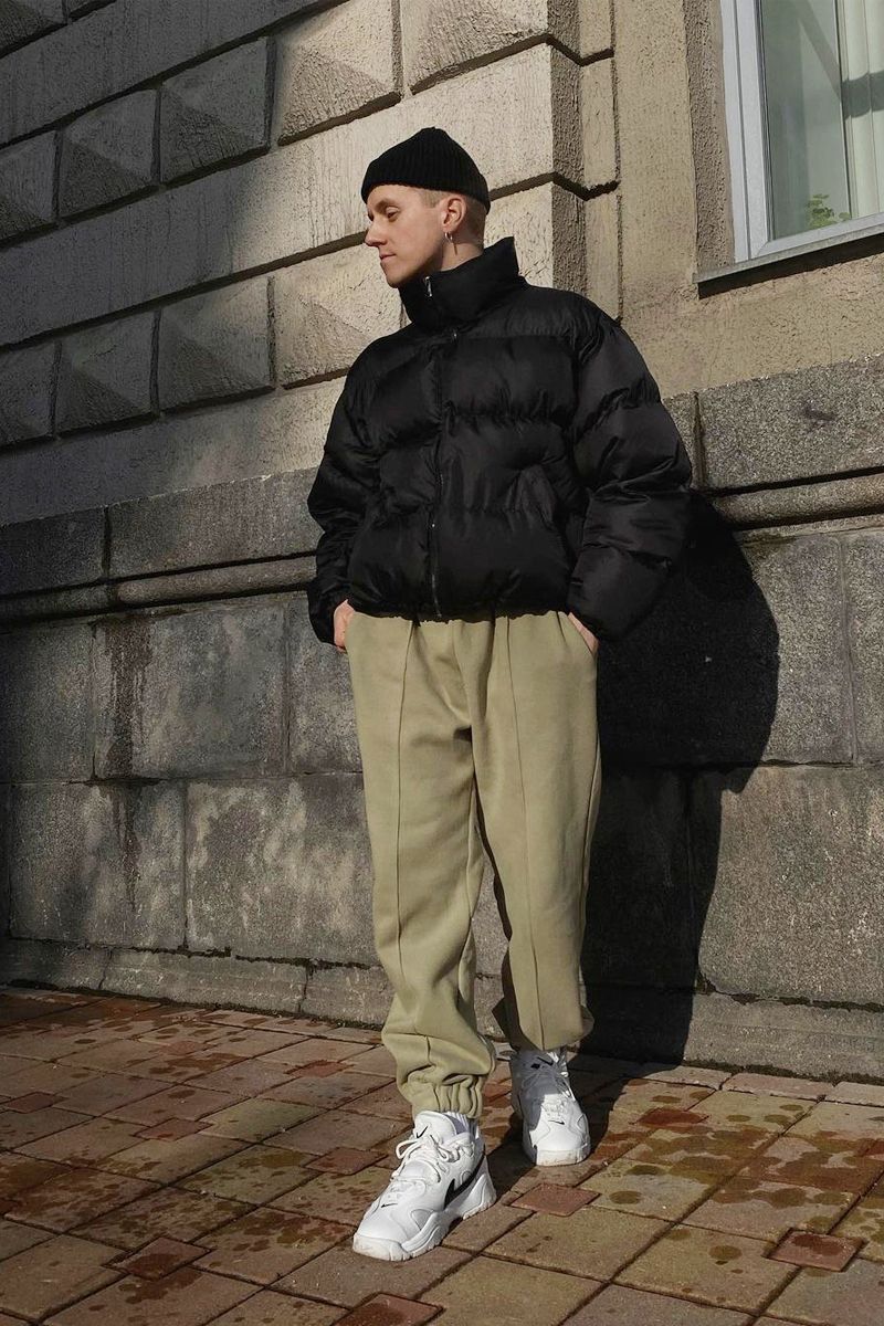 怎樣選擇單品呢?既然色彩擁有了對比感,版型的對比就不要太過強烈,所以選擇寬鬆度相近的單品才是正解。博主就會選擇將帶有膨脹感的短款棉服與寬鬆感十足的束腳褲相結合,讓身材線條看起來更加流暢,從而降低色彩對比的影響。