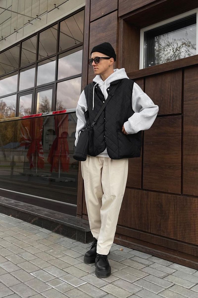 以牛仔褲為代表的亮色搭配出現在男士們的冬季造型之中時,都要遵循這一個搭配原則——重點突出、避免繁雜配色。當造型之中出現了亮眼的藍色衛衣時,其他單品的亮度就要降低,博主所選擇的黑色馬甲與棕色長褲就利用了這一個搭配原則。
