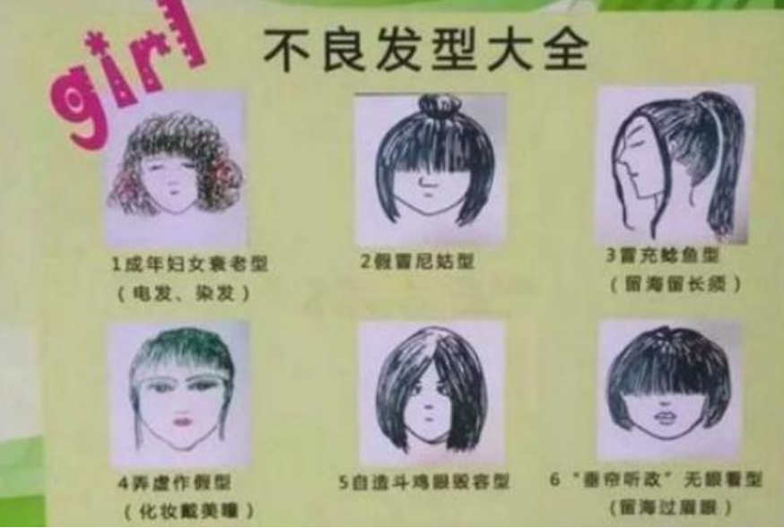 標準髮型也有規定,非標準也有具體的規定,男生女生喜歡的髮型都屬於不良髮型,如下圖所示,男生流行的錫紙燙、鯔魚頭、飛機頭、日漫頭都是不良髮型。