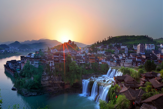 芙蓉鎮是一座「掛在瀑布上的千年古鎮」,古鎮建在一片高大的山石上,四周是青山綠水,一條落差幾十米的瀑布懸掛在古鎮腳下,鎮內的土家吊腳樓緊貼著瀑布而建,瀑布水流入酉水河,蔚為壯觀。