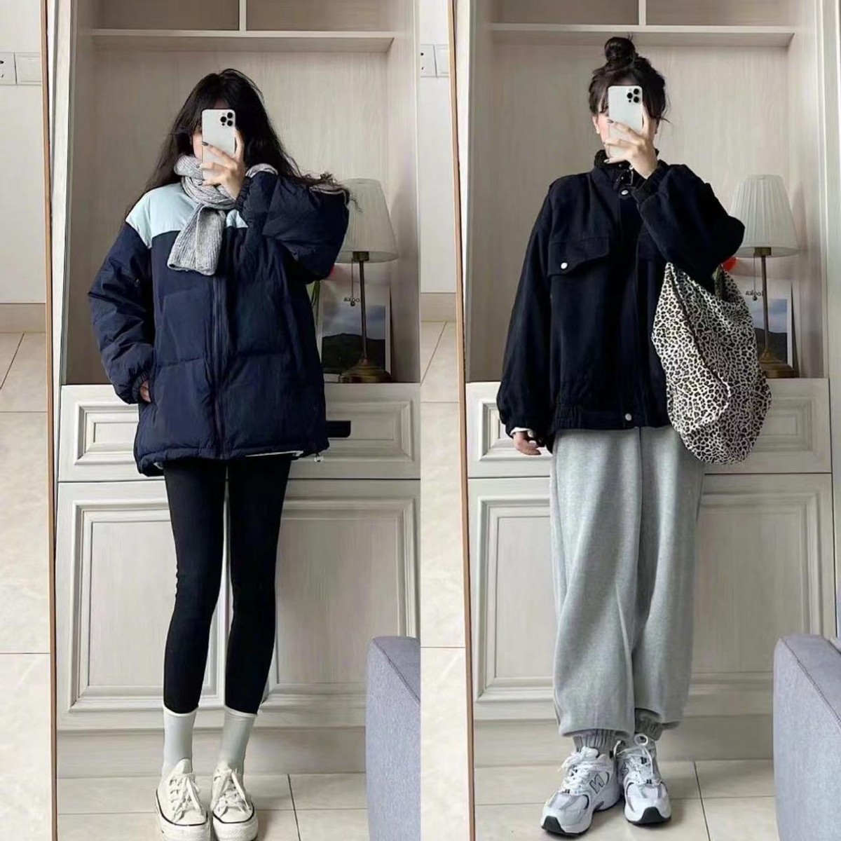 藏青色的羽絨服就是如此,寬鬆,穿起來很顯瘦,而且顏色也很難撞色,很有辨識度。褲子搭配修身的打底褲,穿出上寬鬆下修身的效果,顯瘦效果超好,穿一雙帆布鞋也是學院感拉滿。