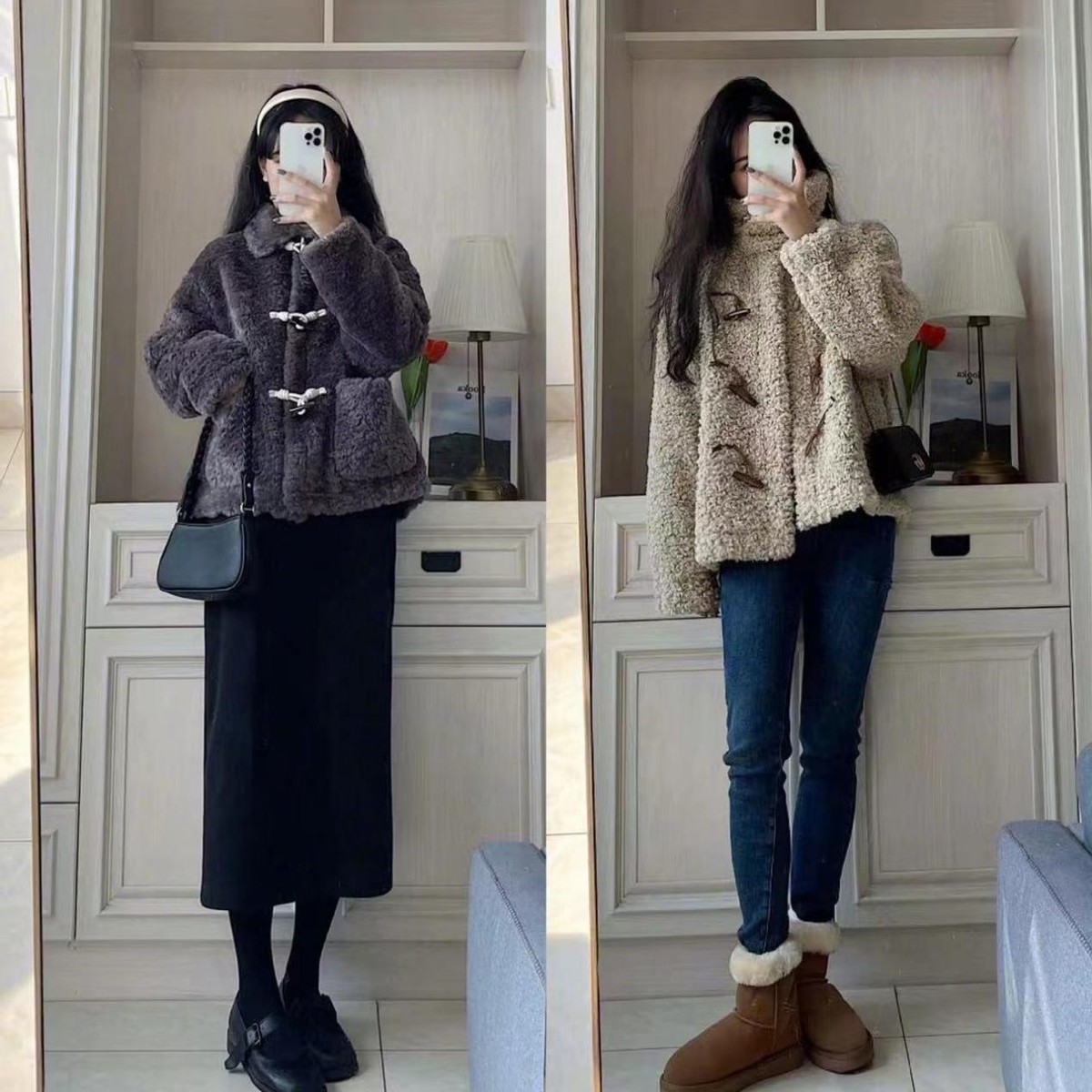 棕色的羊羔毛外套則更復古一些,尤其是加入了牛角扣的設計,讓這件外套看起來更加復古了,誰不想在寒冷的冬季擁有一件毛茸茸的衣服呢?