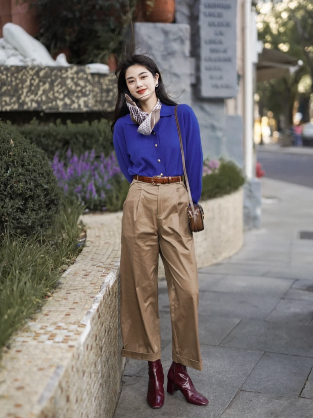 或是換成工裝款式的闊腿褲,復古時髦的撞色搭配,一秒回到80年代的港風。