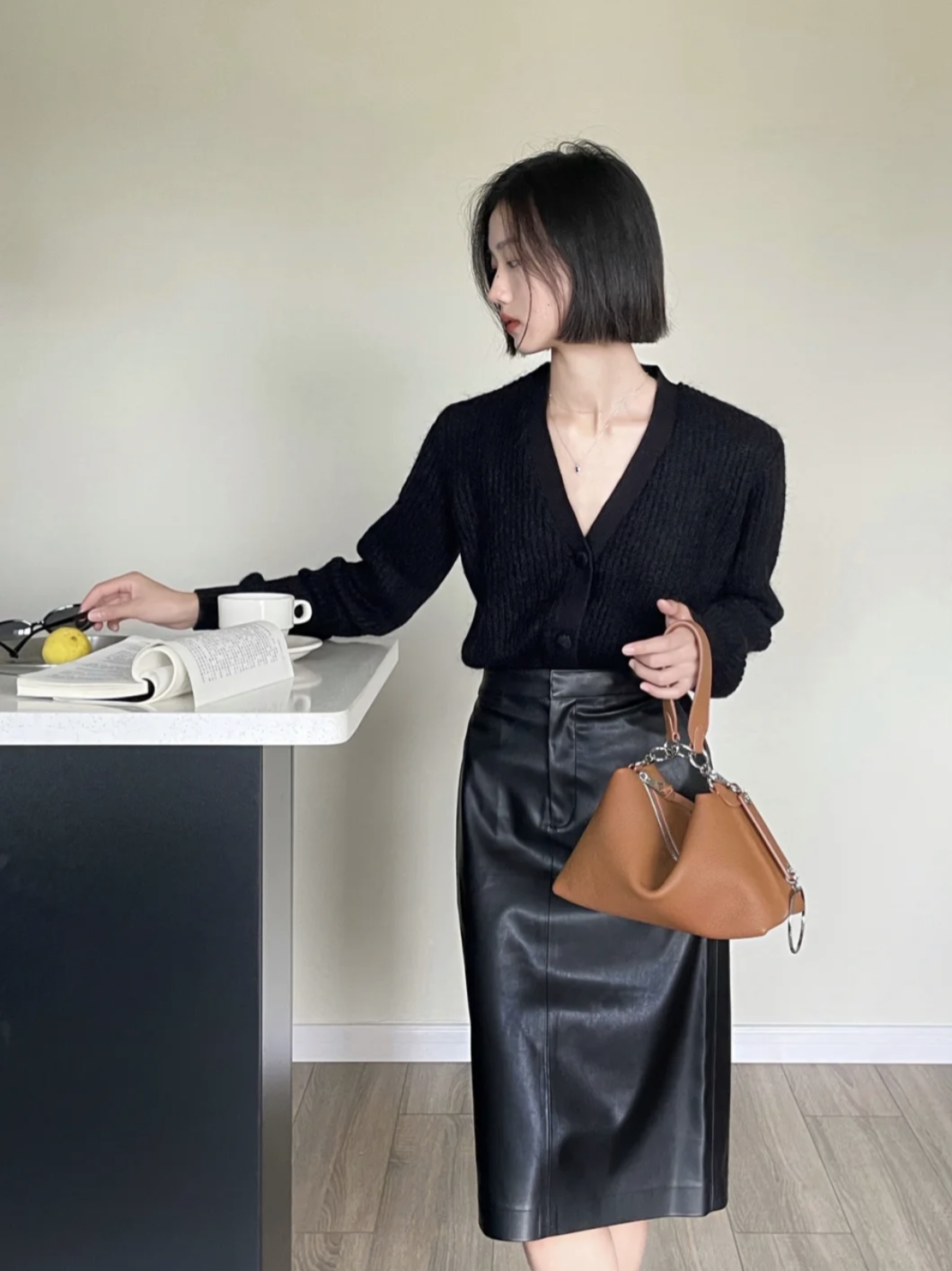 帶點小性感的直筒皮裙和同色系V領針織衫搭配,又酷又颯,摩登架式十足!