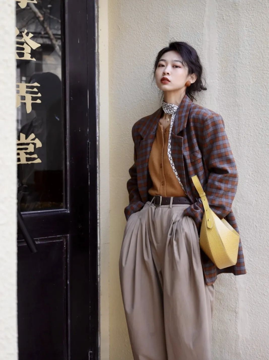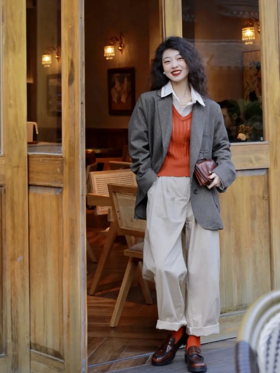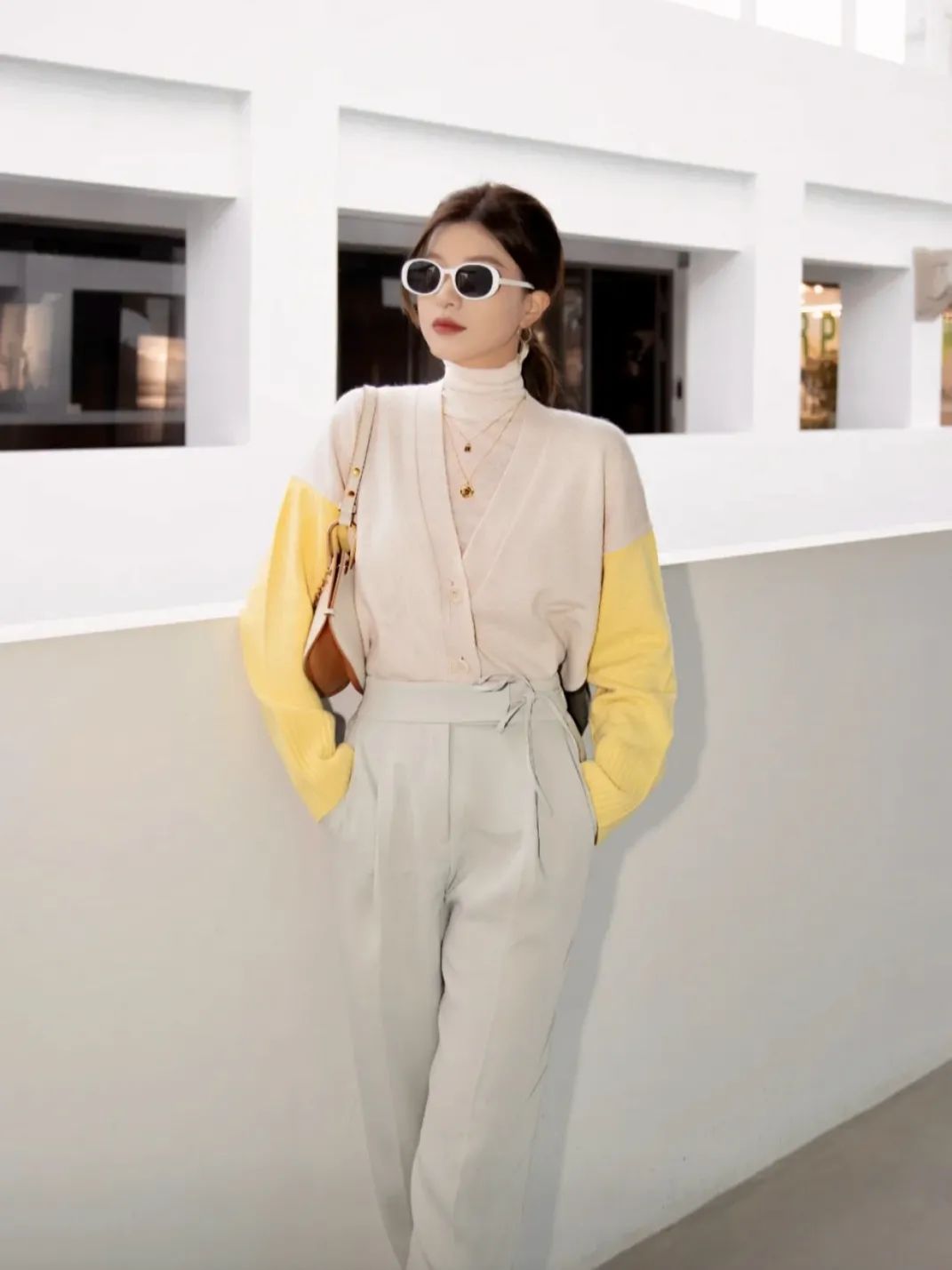 偏正式一點的西裝褲,在材質上和毛衣混搭,精緻時髦的職場女性都是這樣穿~
