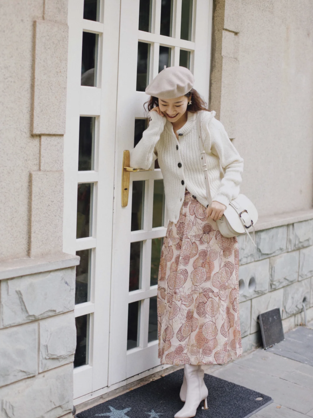 和我一樣在廣東地區的姐妹,還可以試試坑條毛衣+印花紗裙的搭配。