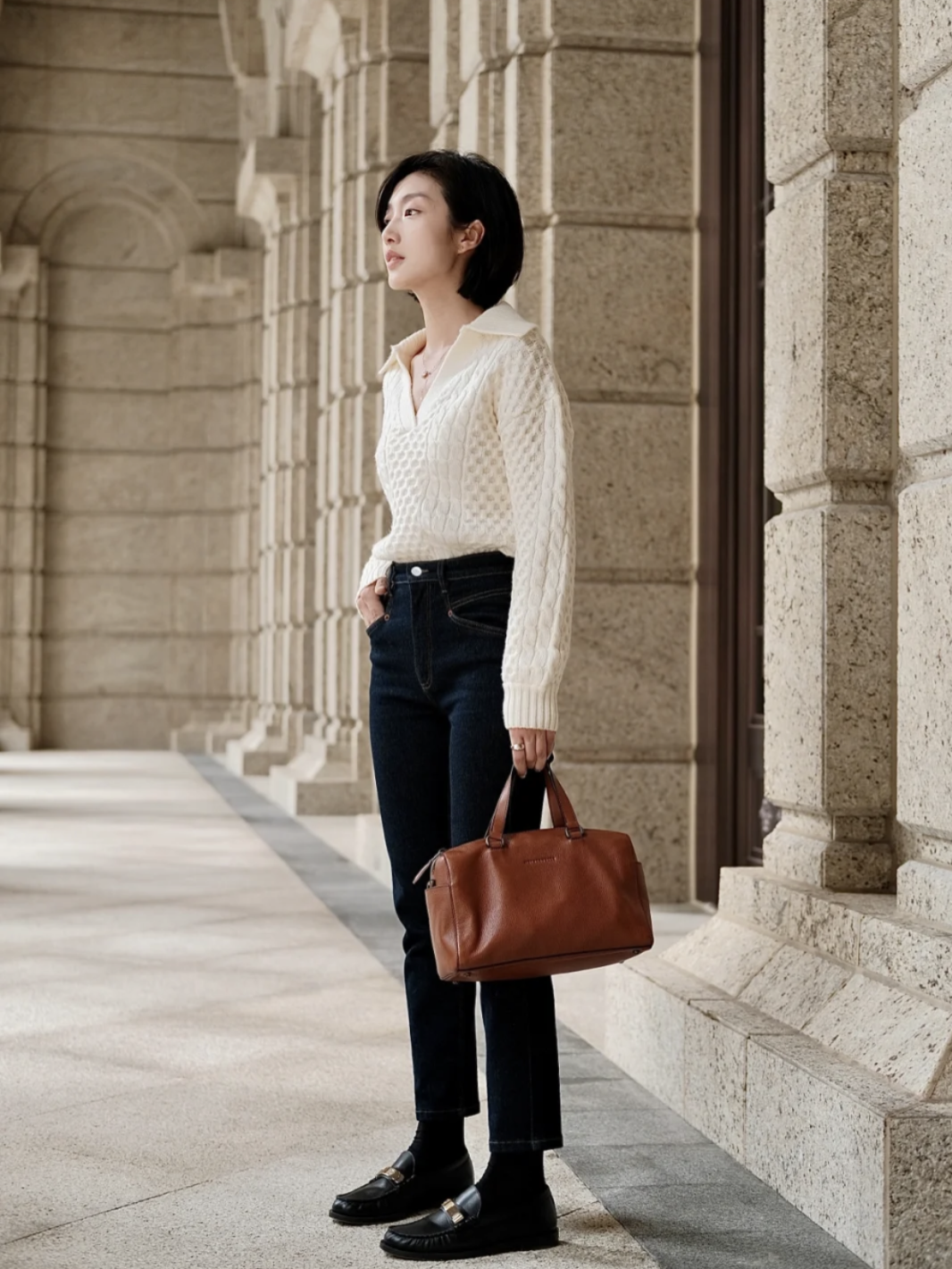 襯衫也可以和毛衣搭配,硬挺直線條與軟糯曲線條形成對比,很適合肩窄的瘦小姐妹。