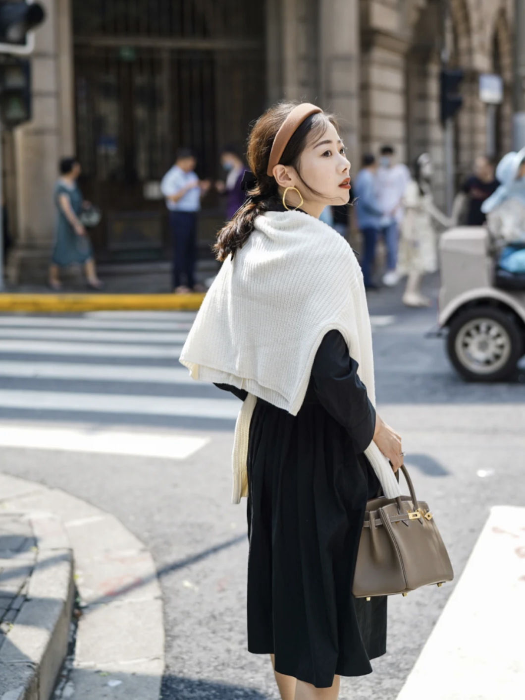 很多博主也很喜歡把毛衣當披肩的穿,基礎的黑白灰隨意披在肩上很有法式愜意的感覺。