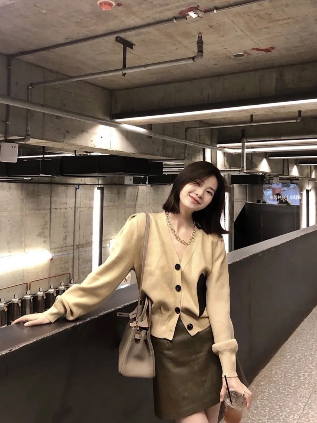 A字裙+毛衣開衫小個子穿俏皮又可愛,V領的設計還能拉長頸部線條,奶奶的配色也超溫柔!