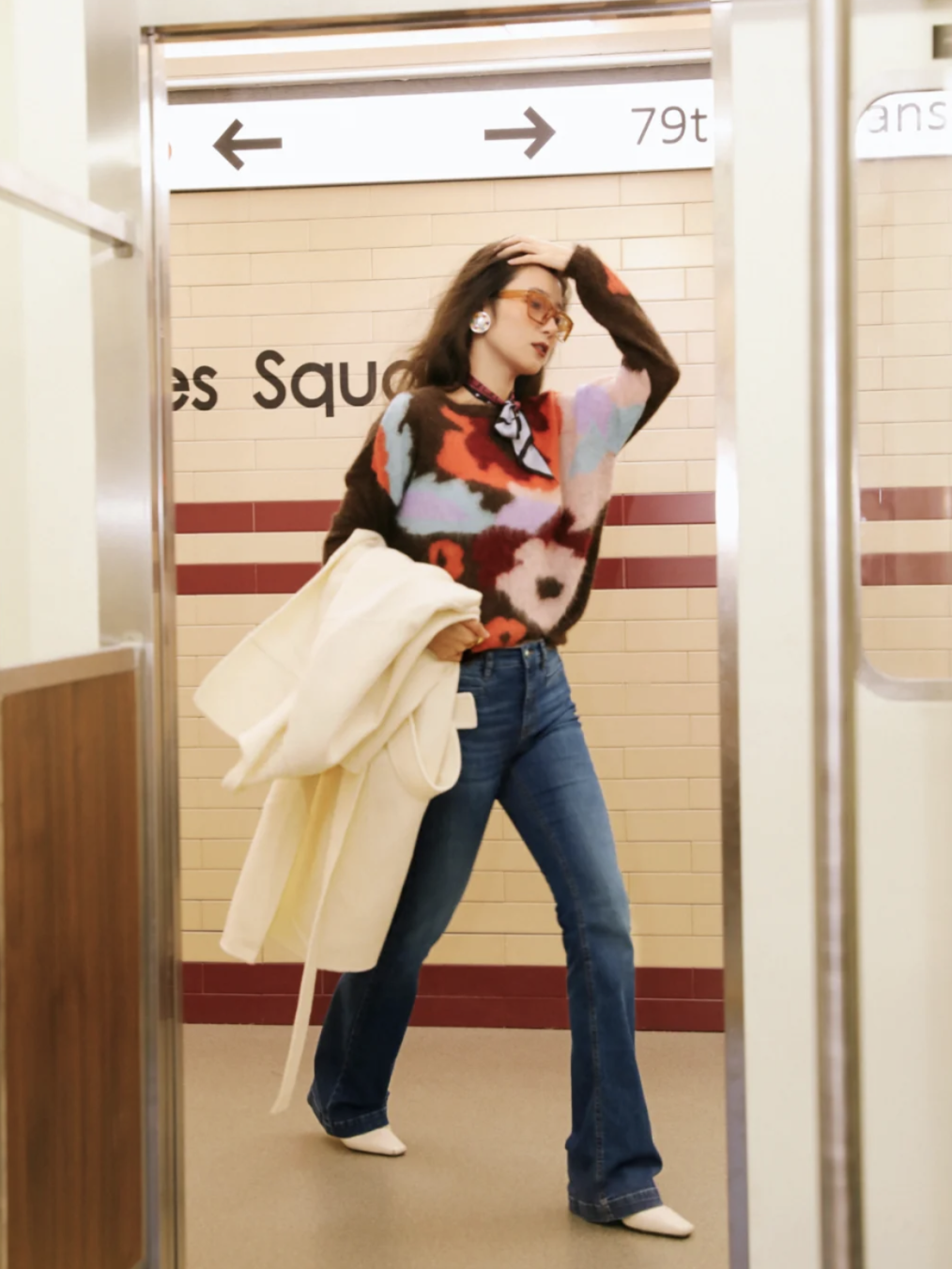 今秋大火的馬蹄褲千萬別放過!印花毛衣下擺紮進褲子裡,搭配尖頭短靴,大長腿就是這麼穿出來的!