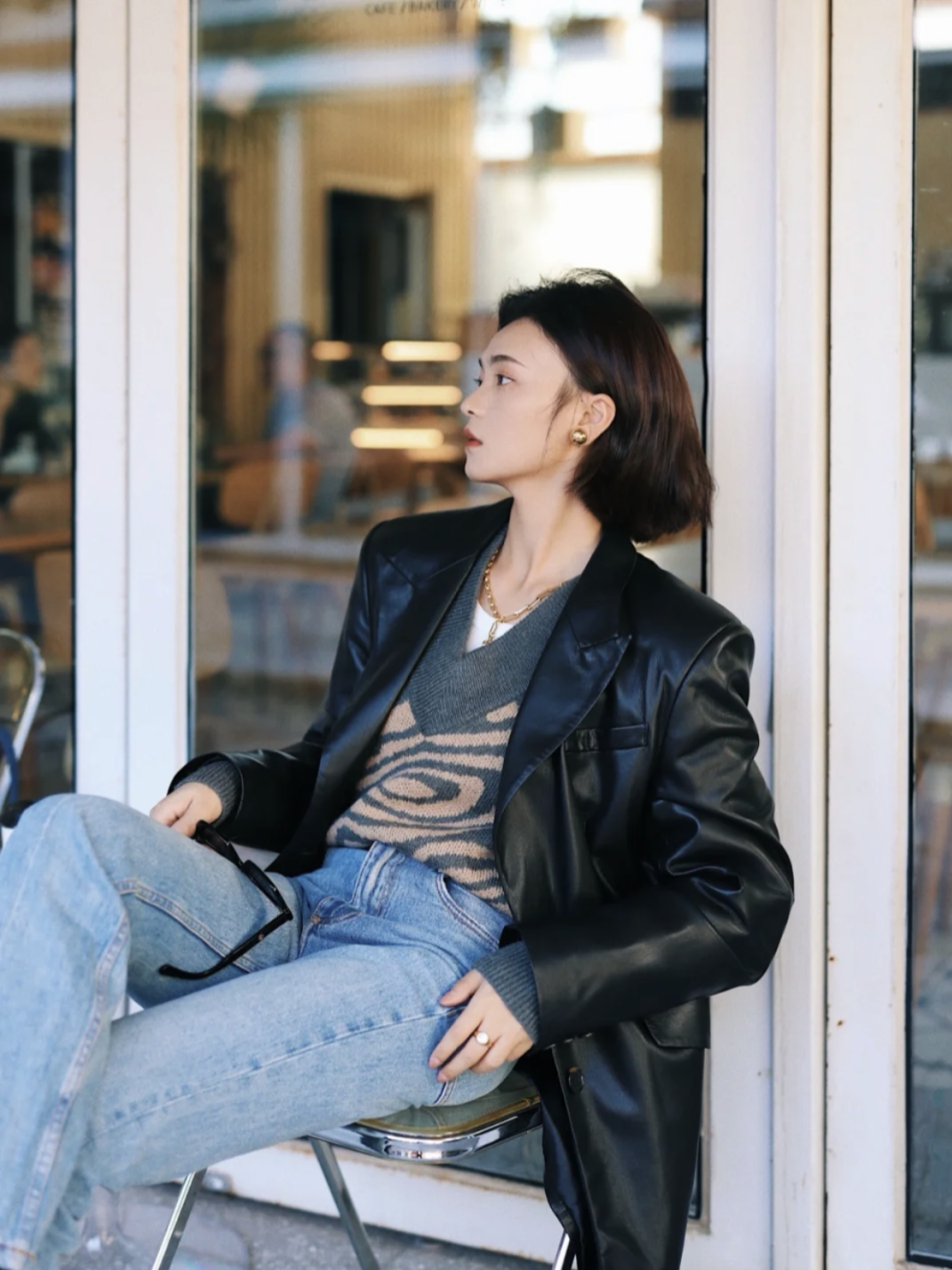 寬大的皮衣很適合走無性別穿搭,毛衣選擇深色偏男款,兩者相結合簡直不要太帥!