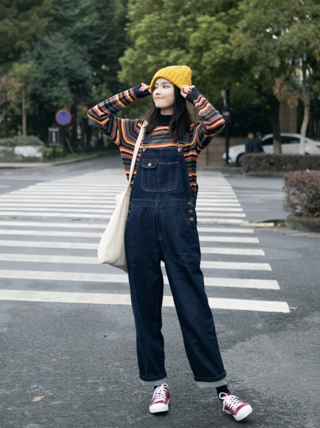 減齡背帶褲+拼色毛衣太適合學生黨模仿了,青春活潑太嫩了